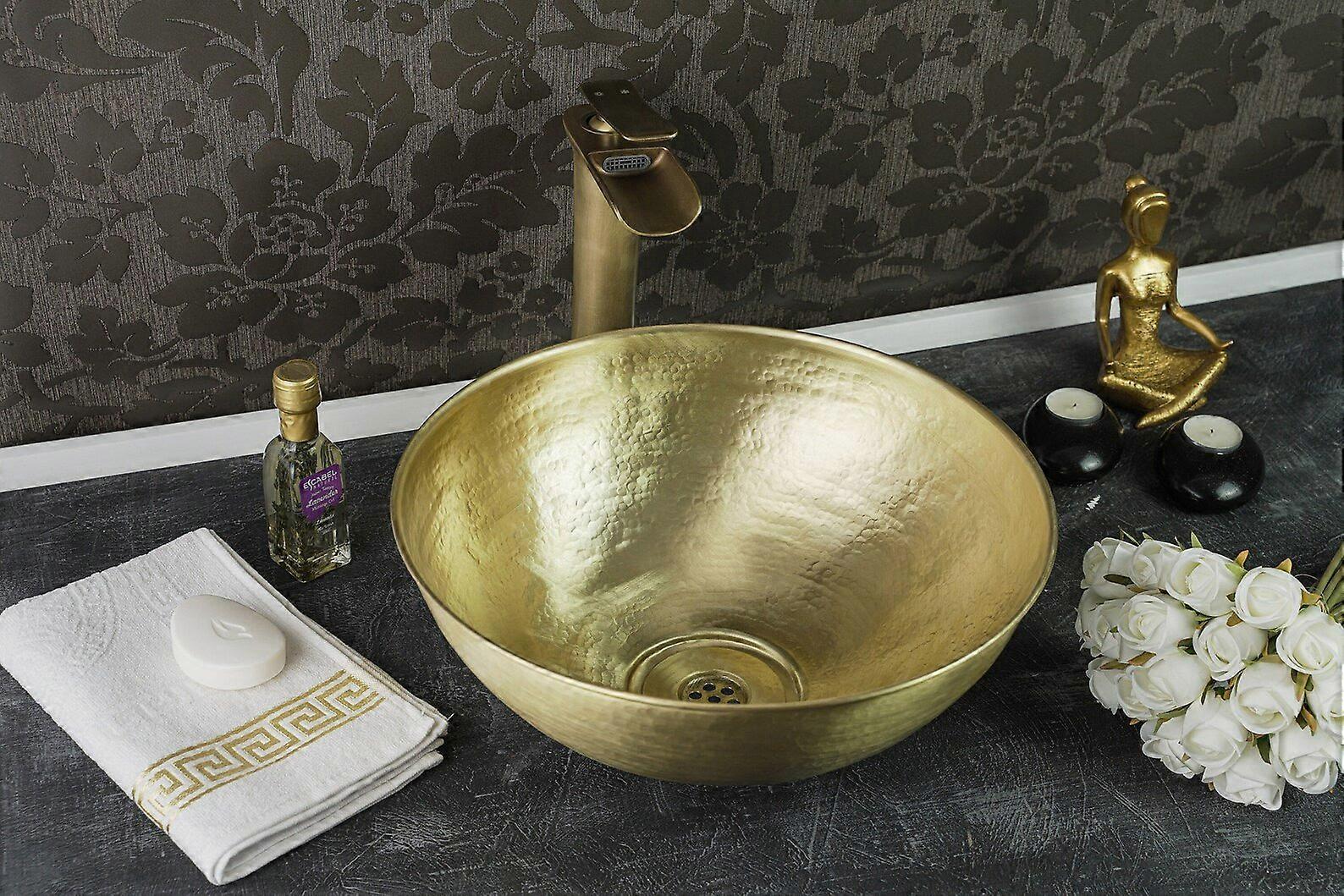 Handmade Matte Solid Brass Bathroom Sink – 16" Hammered Oval Vessel With Drain Cap