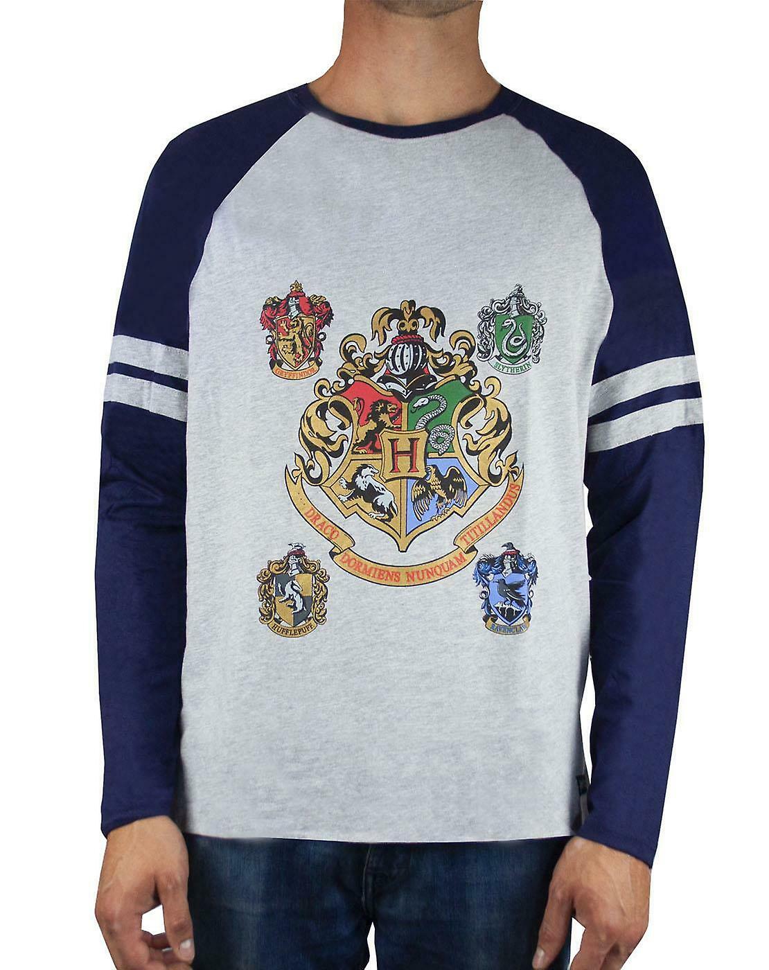 Harry Potter Mens Raglan Short Sleeved T-Shirt Grey Hogwarts House Crests