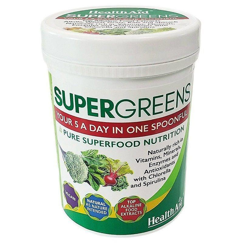 HealthAid SuperGreens powder is formulated with 20 ingredients such as beetroot, broccoli, kale, and seaweeds that provide a concentrated balance of nutrients, shown to help cleanse and detoxify the body, and support energy and clarity. A green superfoods powder can help provide a good balance to your acid foods but above all provides a huge amount of nutrients and antioxidants that can contribute to a stronger immune system and to combat fatigue. What is HealthAid SuperGreens Powder for?HealthAid SuperGreens is a powdered nutritional drink combining the most powerful greens in nature to help supplement your diet and optimize the daily intake of Antioxidants Vitamins, Minerals and Enzymes. It provides ingredients naturally high in essential Amino acids and Vitamins, particularly C, K and E that help reduce oxidative damage to skin cells that may be linked to premature ageing. Greens are also packed with minerals, including Iron, Calcium and Magnesium and are rich in chlorophyll; a key compound involved in all the essential detoxification pathways and believed to assist healthy blood flow due to its molecule structure similar to haemoglobin. HealthAid SuperGreens powder is unprocessed using grasses, herbs extracts and algae harvested at their peak nutritional state to maintain much of the original nutritional and enzyme content with a greater nutrient density by volume. This supplement is ideal for those who are not consuming enough quality fruits and vegetables in their diet. We remind that supplement should not substitute a diet; you should get most of your nutrients by eating every day a balanced amount of fruits, vegetables and grains. Helps supplement the diet to support healthy metabolism and energy levels at a cellular level. Naturally rich in Vitamin B and Folic acid to contribute to the reduction of tiredness May help protect cells from oxidative damageMay help boost immune system or body's resistanceMay help improve endurance sports performance Who may benefit from HealthAid SuperGreens?People who don't consume enough fruits and vegetablesPeople with poor diet living a stressful and demanding lifestyle People wanting to improve energy levels and overall wellbeingPeople going to the gym and athletes looking for extra antioxidants nutrientsPeople who want maintain a healthy lifestyle Recommended Daily IntakeTake once daily by adding one or two scoops (provided) in cold water or fruit juice. Ideal to blend with smoothies. Food supplements should not be used as a substitute for a varied diet. Pack Size: 200gm e Powder Appearance (shape/colour): Green coloured powder. Suitability: Vegan/Vegetarian - Yes Quality Requirements: All the ingredients meet the requirements of USP/NF, BP, EP, BHP pharmacopoeia or supplier specifications Expiration Period: 2 years from date of manufacture Storage: Store in a cool dry place, keep out of sight and reach of children Caution: Please seek professional advice before taking this supplement if you are pregnant, breastfeeding or on prescribed medication