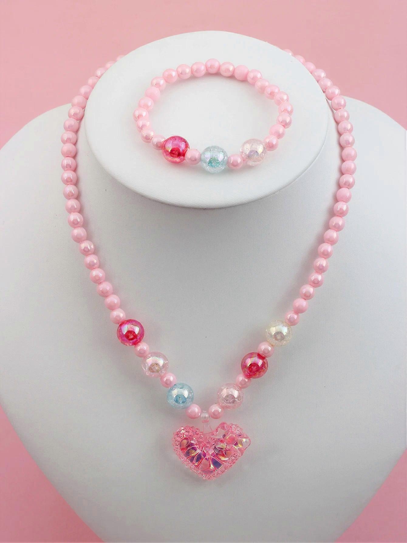 Heart Beaded Necklace And Bracelet Set - 2pcs, Everyday Wear, Color Varies