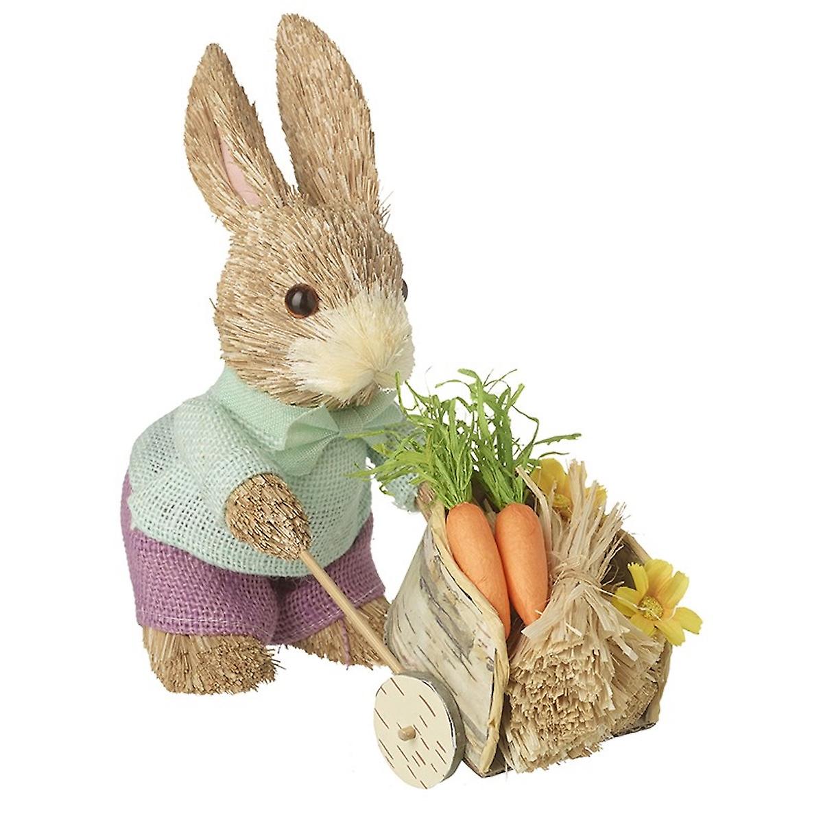 From the Heaven Sends [/heaven-sends.html] collection comes this beautifully made bristle Rabbit decoration, shown pushing a wheelbarrow loaded with carrots If you love more intricate Easter decorations then this bristle Rabbit is the perfect addition to your high quality Easter display. This bristle Rabbit can be seen wearing a green top and purple trousers, finished wonderfully with beady eyes and an adorable little wheelbarrow.  Pair this bristle Rabbit with other wooden Easter decorations for a rustic feel, it will look incredible on your mantelpiece or as an accompaniment on your dining room table. Celebrate Easter with this gorgeous bristle Rabbit today Explore our wide range of Easter decorations [/easter-decorations-twig-trees.html] on our website, to include other bristle decorations.