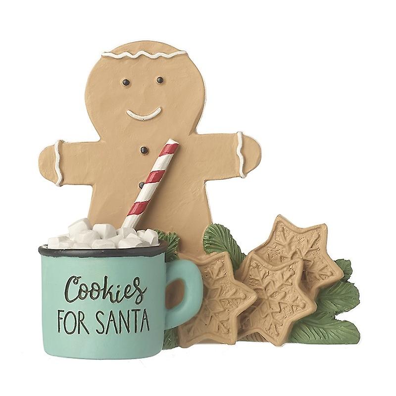 HEAVEN SENDS COOKIES FOR SANTA GINGERBREAD CHRISTMAS DECORATION Display your cookies for Santa amongst this glorious decoration from Heaven Sends. [/heaven-sends.html]Â Made from poly resin clay, this fabulous decoration features a Gingerbread person with a delicious looking hot chocolate, paired with some star shaped cookies for that festive touch. A unique decoration that will take pride of place in any room of your home, just make sure you leave those cookies for Santa