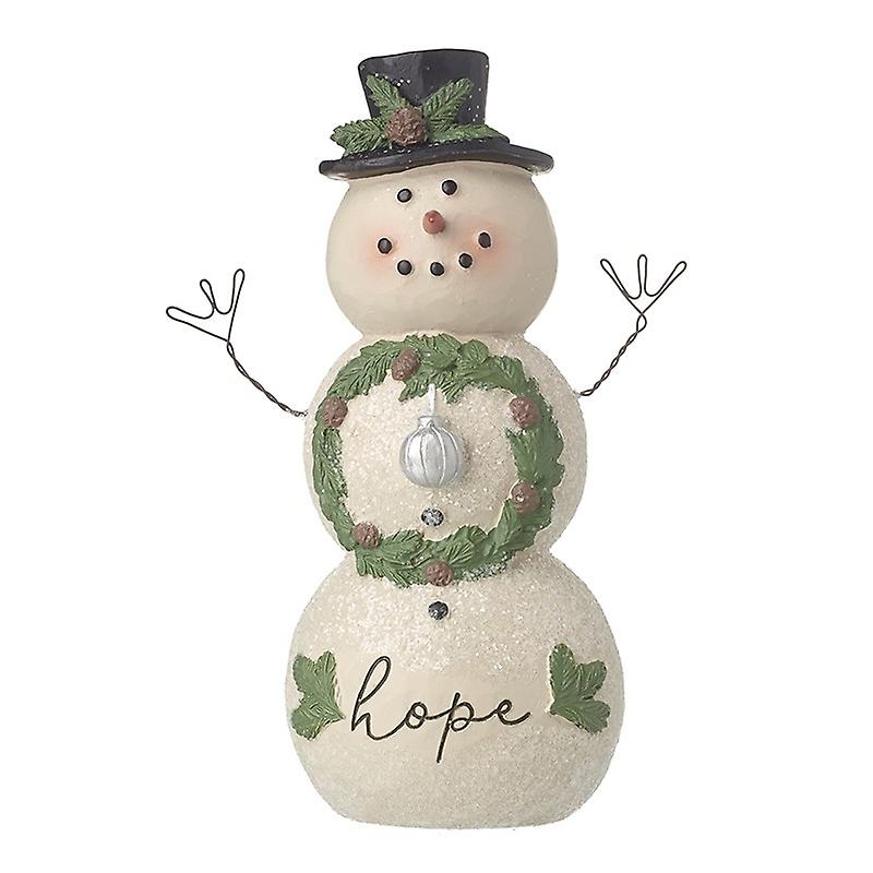 HEAVEN SENDS HOPE SNOWMAN CHRISTMAS DECORATION Spread hope and joy this Christmas with this novelty snowman decoration from Heaven Sends [/heaven-sends.html]. This resin decoration features a three tiered snowman, finished with accents of holly and a festive wreath. Sprinkled with silver and white glitter for a touch of sparkle, this fantastic snowman will bring a glittering and joyous feel to any room. Completed with a 'hope' motif for a truly loving and comforting feel this Christmas. Decorate your home with this 'hope' snowman by displaying it on your coffee table, mantelpiece or bookshelf. Paired with other novelty decorations you can create a winter wonderland in your home with this snowman, a reminder of all of the hope and faith you can receive during Christmas time.  Discover more from our Christmas decorations [/christmas-decorations.html] on our website today, to include more novelty ornaments.