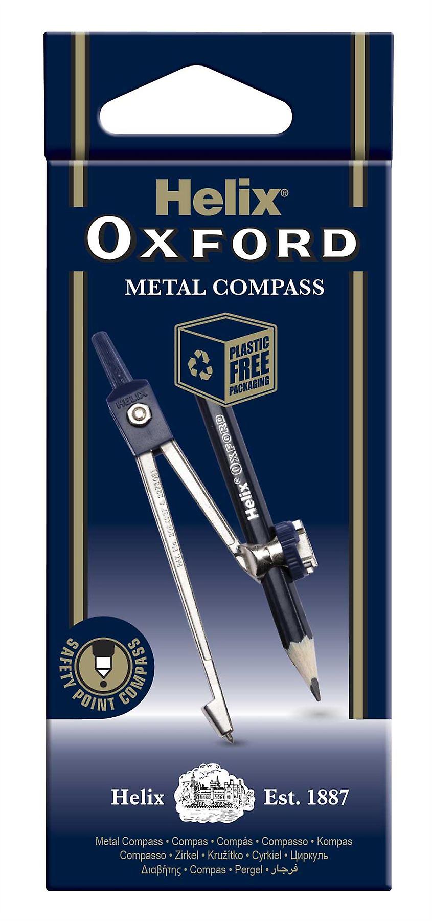 The Helix Oxford Metal Compass and Pencil set comes in a black package and includes a metal self centring compass with a camlock pencil retaining ring that cannot be removed and a 9cm long HB pencil.