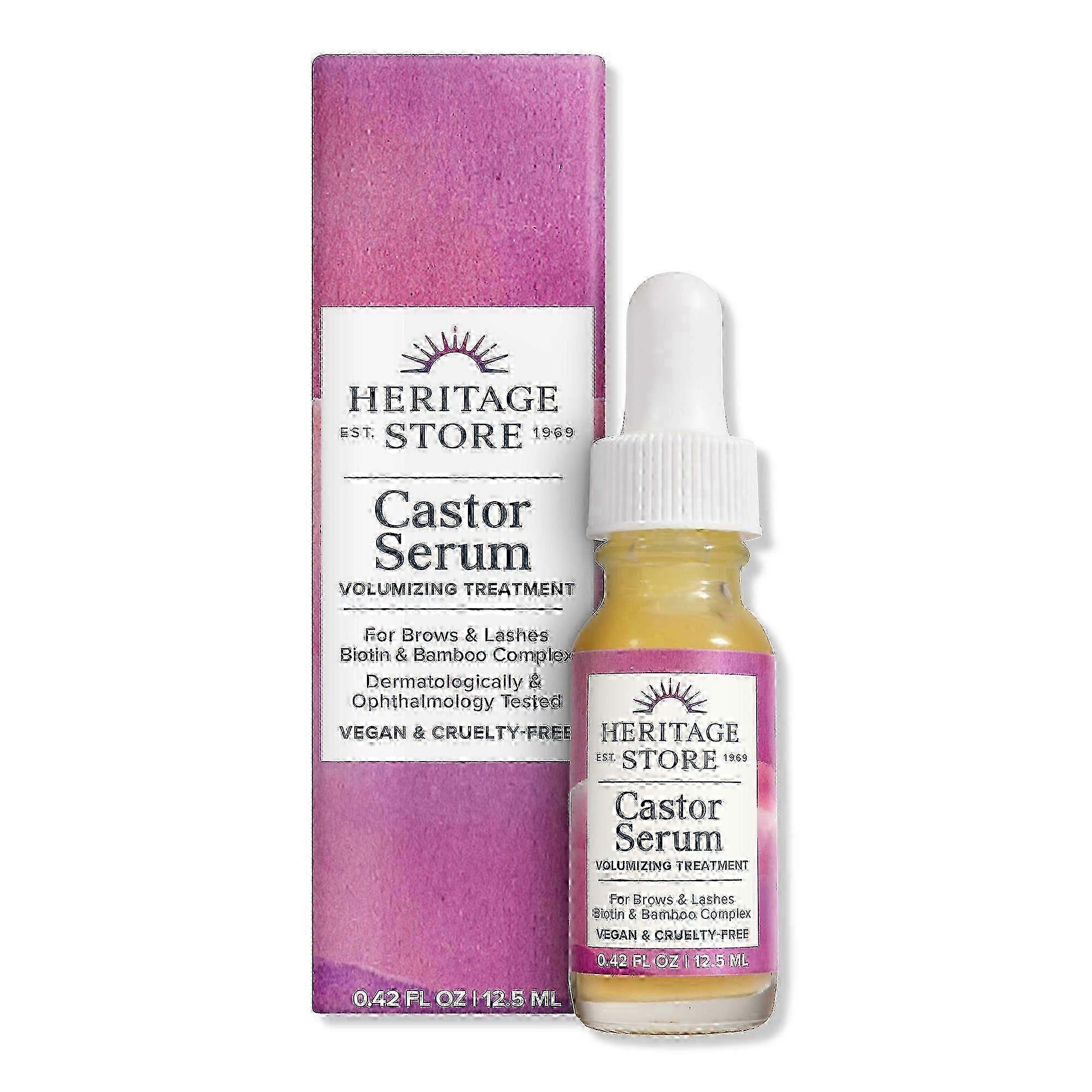 Lush lashes and bold brows. Organic Castor Oil, Black Castor Oil and a Hair Complex come together in Heritage Store Castor serum Volumizing nighttime nourishing treatment. Includes a dual end brush for brow and lash application Benefits Thicker, longer-looking lashes and fuller-looking browsDermatologically tested and ophthalmology testedIncludes a dual end brush for brow and lash applicationVeganFormulated without Parabens, sulfates and phthalates Features 82% of subjects reported their lashes and brows look healthier71% of subjects reported their lashes seem thicker after using this product82% of subjects reported their brows seem fuller88% of subjects reported the product as non-irritatingCastor Serum study reported after eight weeks of daily use. Results based on a consumer perception study Key Ingredients Hair Complex, a combination of Biotin, Bamboo, Pumpkin and Amla, plus our Keratin-Supporting Blend for thicker, luscious lashes and bold brows.Organic Castor Oil conditions and strengthens brows and lashes for a fuller appearance.Black Castor Oil nourishes and clarifies the hair follicles. Suggested Use: After your nightly skin care routine, add one to two drops to the Heritage Store spoolie brush and apply to brows evenly. For lashes, use the eyeliner wand and apply to the base of lashes - be careful of eyes Shake well before using. Expiration Date: We have fresh stock each week with exceptional expiration dates prior to APRIL 2024. Products will expire no later than six months to 1 year after receipt. Product Packaging: Please note that some manufacturer may often change their packaging. This product may arrive different from what is pictured. We will always ship the most up-to-date packaging to our customers. Please contact us if you have any questions about this product or would like to request an older version of this product. Healthcare Disclaimer: Content on this site is for reference purposes only. OTC Shoppe Express does not represent or warrant that the nutrition, ingredient, allergen and other product information on our Web or Mobile sites are accurate or complete, since this information comes from the product manufacturers. On occasion, manufacturers may improve or change their product formulas and update their labels. We recommend that you do not rely solely on the information presented on our Web or Mobile sites and that you review the product's label or contact the manufacturer directly if you have specific product concerns or questions. If you have specific healthcare concerns or questions about the products displayed, please contact your licensed healthcare professional for advice or answers. UPC: 000002591976 Weight: 0.57 lbs