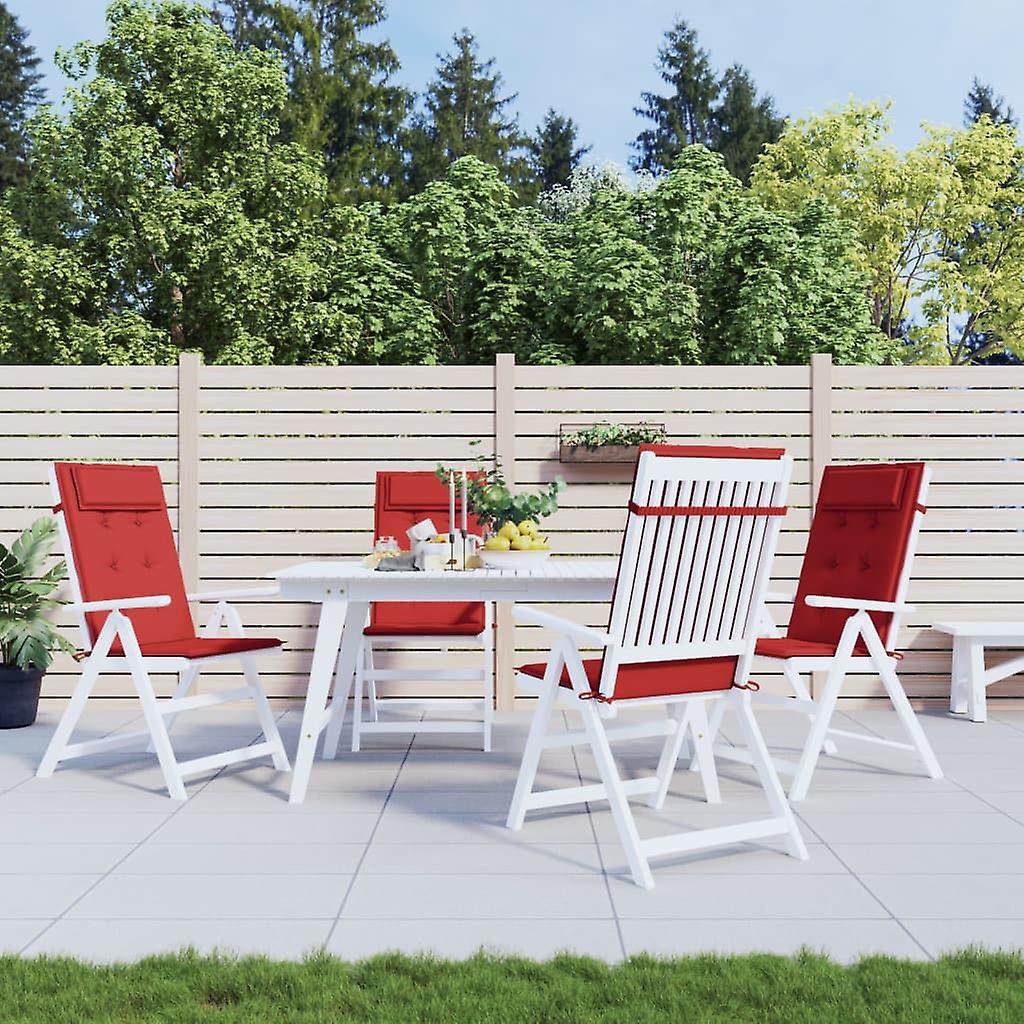 Verleihe deinem Außenbereich im Handumdrehen eine frische Note mit diesen komfortablen Hochlehner-Auflagen Langlebiges Material: Oxford-Gewebe ist leicht, wasserabweisend und resistent gegen Schäden und Schmutz. Das verwendete Garn macht das Gewebe haltbar und atmungsaktiv. Außerdem ist es von Natur aus faltenbeständig.Weiche Polsterung: Die Auflage ist mit Schaumstofffasern gefüllt, die für einen besonders weichen und optimalen Sitzkomfort sorgen. Das Stuhlkissen nimmt nach jedem Gebrauch wieder seine ursprüngliche Form an.Vielfältig einsetzbar: Das Kissen eignet sich für den Einsatz im Freien, z. B. für Gartenmöbel, aber auch in Innenräumen als Sitzkissen für Hocker und Ottomanen. Außerdem ist es eine schöne Dekoration, die deinem Zuhause einen frischen Look verleiht. Gut zu wissen:Das Produkt wird unter Vakuum verpackt und braucht daher einige Zeit, um sich auszudehnen und seine ursprüngliche Form wieder anzunehmen. Farbe: RotMaterial: Oxford-Gewebe (100 % Polyester)Füllmaterial: SchaumstofffaserAbmessungen: 120 x 50 x 3 cm (L x B x T)Kopfpolster-Abmessungen: 40 x 20 x 3 cm (L x B x T)Geeignet für Hochlehner-StühleWasserabweisendLieferung umfasst:4 x Hochlehner-Auflage