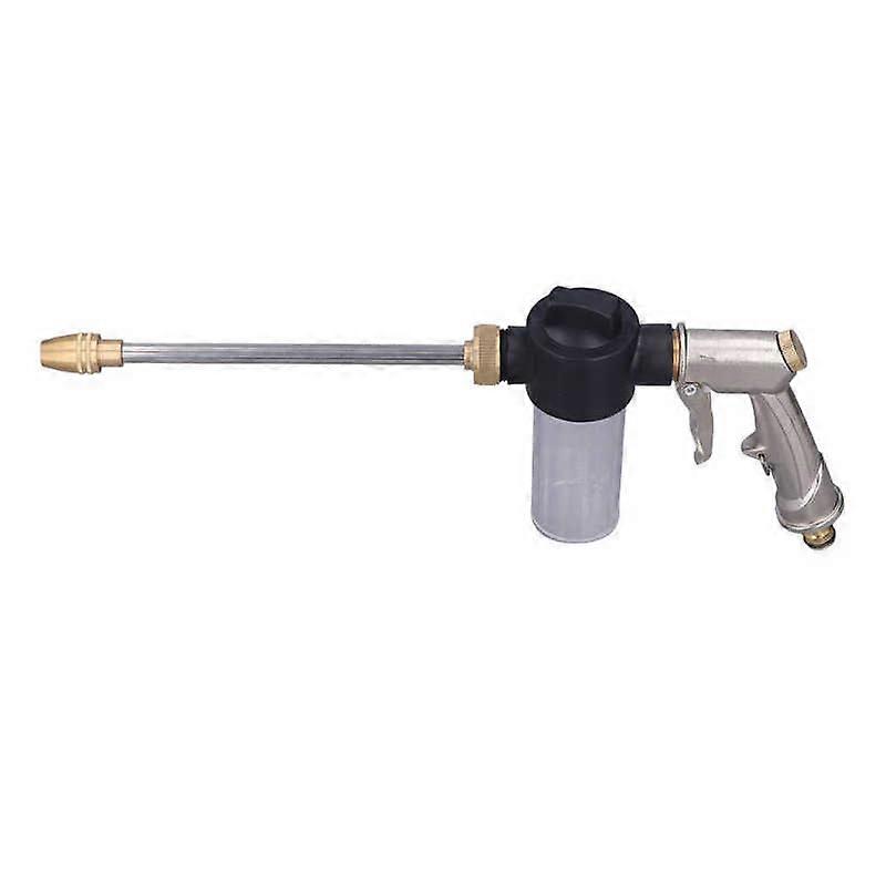 High Pressure Water Gun Garden Hose Sprayer With Wand Nozzle Foam Spray Sprayer Purifier Equipment Feature:1. Rotating hose nozzle: flexible and adjustable fine mist water flow, moderate spray jet or jet jet by rotating the hose nozzle from left to right. Home garden hose pipe wand with adjustable nozzles can meet the needs of every garden lover.2. Durable enough zinc alloy body: the hose nozzle is developed and improved on the basis of the traditional plastic sprinkler nozzle. The adjustable spray head is made of brass and can be twisted thousands of times. The zinc alloy body is durable enough to be used for a long time.3. Hose Coupler: The stainless steel rod is equipped with a brass standard garden hose connector instead of an aluminum body, strong and durable, not easy to bend4. Easier Cleaning: Non-corrosive high-pressure sprayer and multiple spray patterns are suitable for garden watering and cleaning. Strong water pressure makes it easy to clean. Multiple spray modes make it a handy and practical tool.5. Widely Used: The high pressure water gun is suitable for garden watering, car wash, floor cleaning, pet washing, providing great convenience. Specification:Item Type: High Pressure Water GunMaterial: Brass + Zinc Alloy + Stainless SteelSpray Distance: Approx. 10 - 20 meters/32.8 - 65.6ftFoam Container Capacity: 100mlSuitable Hose: 1/2inScope of Application: Garden Watering, Car Wash, Floor Cleaning, Pet WashingPackage List:1 x Water Gun1 x Container1 x Spray Spigot