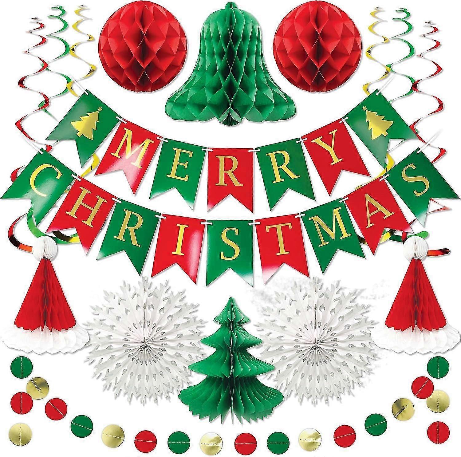 ULTIMATE CHRISTMAS DECORATION - This Christmas decoration set brings a festive atmosphere to any room. Thanks to the fasteners, the vintage decor can be quickly assembled and easily reused. Other brands require tedious assembly and use disposable tape. An impressive and eco-friendly Christmas decoration set.HIGH QUALITY, LARGE CHRISTMAS DECORATION - This beautiful Christmas decoration set is well made, yet exceptionally durable and sturdy. PLASTIC FREE - Our paper packaging is reusable and convenient for storing Christmas decorations. Other brands package each Christmas ornament individually, which creates a lot of plastic waste. Our goal is to actively reduce plastic waste.TRADITIONAL FESTIVAL - This Christmas decoration adds a festive touch to any room. This Merry Christmas decoration set comes with a Christmas decoration garland, perfect for fireplaces, stair railings, Christmas parties and Christmas tables.All the details - We provide customer service at all times to ensure customer satisfaction. High quality, reusable decorations designed in the UK. Join our thousands of satisfied customers who have purchased our products. The set contains: 1 x Merry Christmas pennant banner, 1 x bell, 1 x Christmas tree, 2 x Santa hats, 2 x snowflakes, 2 x Christmas balls, 6 x foil swirls, 1 x double-sided paper garland.