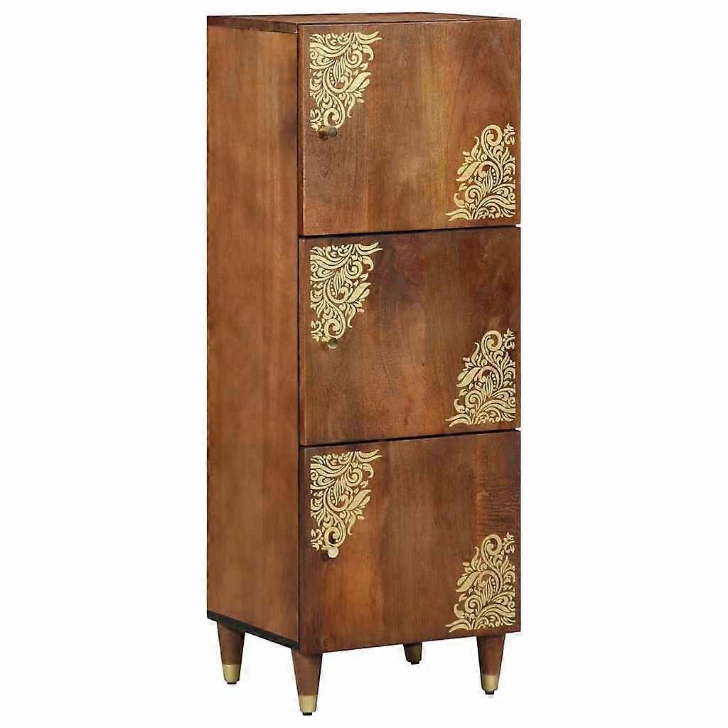 Farbe: BraunMaterial: Massivholz MangoGesamtabmessungen: 40 x 33 x 110 cm (L x B x H)Gewicht: 17,88 kgMit goldfarbigem SiebdruckdesignMit MessingknöpfenMit Türmit Regalmit 3 ScharniertürenNur für den InnenbereichLieferumfang:1 x HighboardMontage erforderlich: Ja