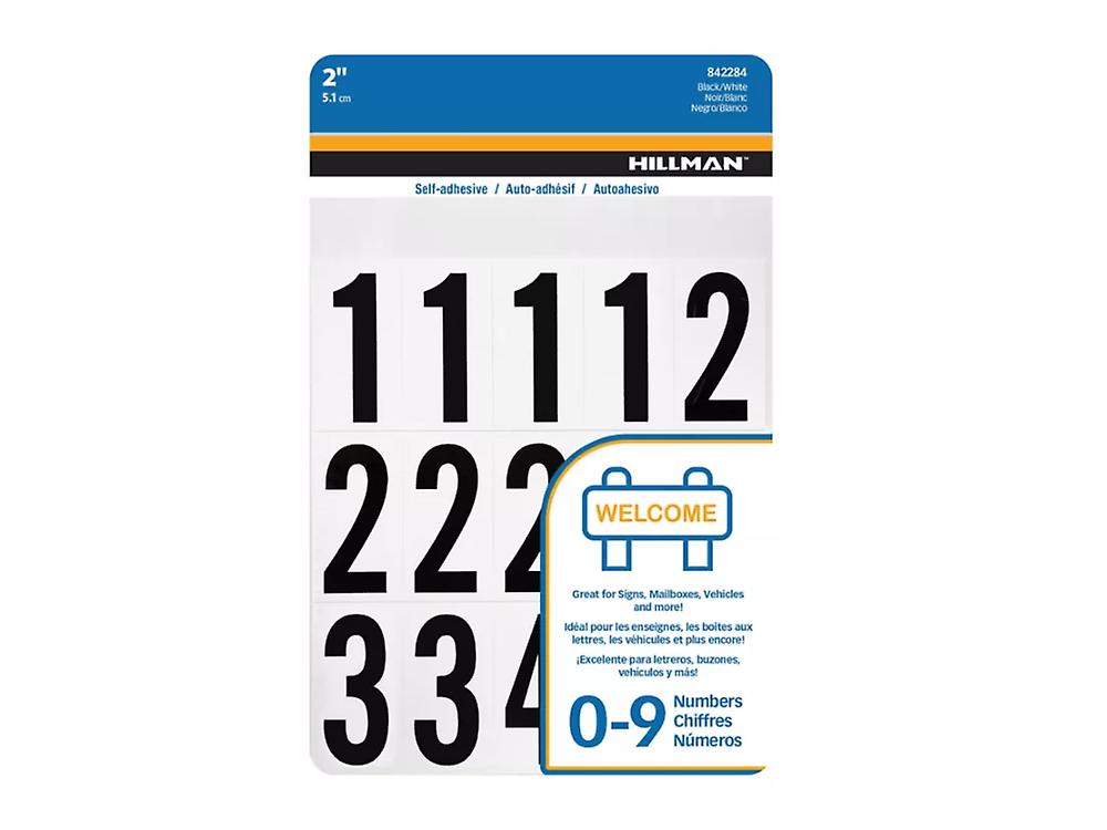 Hillman 842284 Outdoor Decoration Vinyl 2 Inch Black and White Numbers Packaged