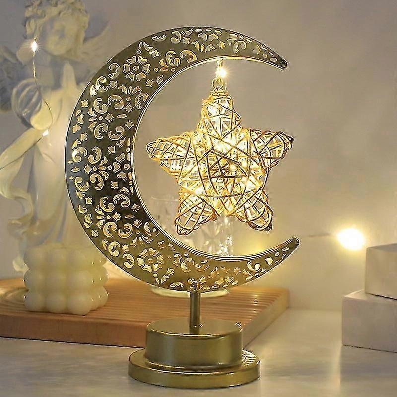 Holiday Decoration LED Table Lamp Vines Star Iron Art Hollow Moon Desktop Light[Romantic Magic Moonlight] This LED lamp has a unique moon shape,which looks very stylish and retro when turned on. It can not only be used as a bedroom lamp to create a warm atmosphere,but also decorate Christmas and holidays[Battery-powered table lamp] Just install 3 AA batteries (not included) and press the button to turn it on. It can be used without cable plugging in,is anti-electric shock,and safe for children. With energy-saving design,it can be used continuously for about 24-30 hours (depending on battery capacity)[Warm Light] The lamp emits warm yellow light from the light string,which is soft and not dazzling,protecting your eyes,and the light is perfect,which can illuminate the whole room and is an excellent decorative light for the bedroom[Creative Night Light Gift] The bright and beautiful moonlight can be given as a gift to your children,friends,family and lovers,especially on special days such as birthdays and Christmas. The night light can be taken anywhere,such as camping,and can also be used at backyard parties[Decorative Light] The vine star design adds a unique and novel style to the moon lamp,which is not only suitable for decorative lights in children's rooms,bedrooms,and living rooms,but also can be used as decorations at Christmas,and Thanksgiving,Halloween,and birthday parties,impress your guestsSpecifications:Material: Iron,PlasticSize: Approx. 28x18cmBattery Type: 3 x AA Batteries (Not Included)Note:The picture may differ slightly from the actual color of the product. We will try our best to show you the exact color.Due to manual measurement,there may be slight differences in size.Package included:1 x Desk Lamp