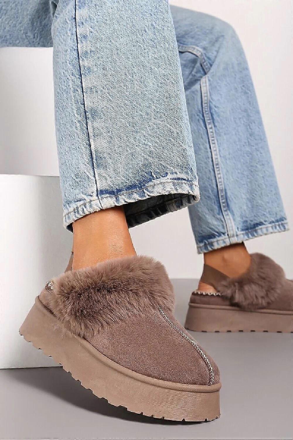 House Of Sehrish JD6 Khaki Platform Sling Back Slipper Embroidered Faux Fur Lined Cosy Fluffy Shoes