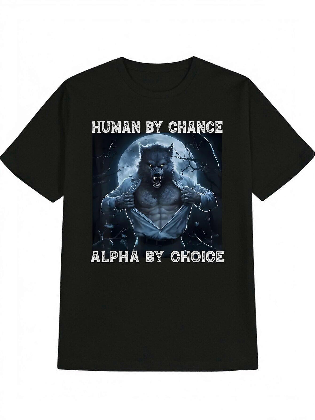 Human by Chance, Alpha By Choice" Funny Werewolf Absurd Print T-Shirt for Men - American Humor Graphic Black Tee with Retro Style