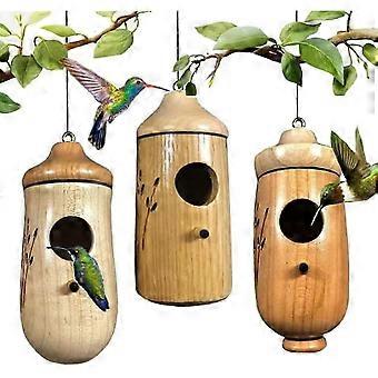 Natural Material The three hummingbird houses are made of natural cherry wood, oak, and maple, which have a more natural taste and are easier to attract hummingbirds to build their nests. They are environmentally friendly and durable, strong and breathable, and can be used for a long time. the exquisite workmanship makes it a very unique garden decoration even in the season without hummingbirds.Product Size The size of the hummingbird house is approximately 5.12 x 2.36 inches.Easy to Use There is a gold metal loop at the top of the hummingbird house where you can easily insert the rope or wire of your choice to hang it.Wide Applications Our birdhouses can be used in gardens, balconies, porches, tree trunks, and can also be hung in offices or wherever you want to hang outside or indoor.Hummingbird HouseIn early spring, hang a charming, decorative hummingbird house! Habits of the hummingbird include males migrating early to "stake" their territory out, and they can attract up to 25 females! While there is no guarantee they will use this decorative house (there are no guarantees with any birdhouse), they are a very attractive addition to any backyard or garden.Product DescriptionWooden Hummingbird HouseHummingbird House, 2022 New Wooden Hummingbird House for Outside Hanging, Hummingbird Swing Hummingbird Nest for Wren Swallow Sparrow Hummingbird Finch HousesNatural MaterialThe three hummingbird houses are made of natural cherry wood, oak, and maple, which have a more natural taste and are easier to attract hummingbirds to build their nests.Easy to UseThere is a gold metal loop at the top of the hummingbird house where you can easily insert the rope or wire of your choice to hang it.Wide ApplicationsOur birdhouses can be used in gardens, balconies, porches, tree trunks, and can also be hung in offices or wherever you want to hang outside or indoor.The size of the hummingbird house is approximately 5.12 x 2.36 inches.About hummingbird:In some American myths, the hummingbird is a symbol of the sun god. In the new century, the habitat of hummingbirds is gradually shrinking with the destruction of forests!If you love it, please give it a home!