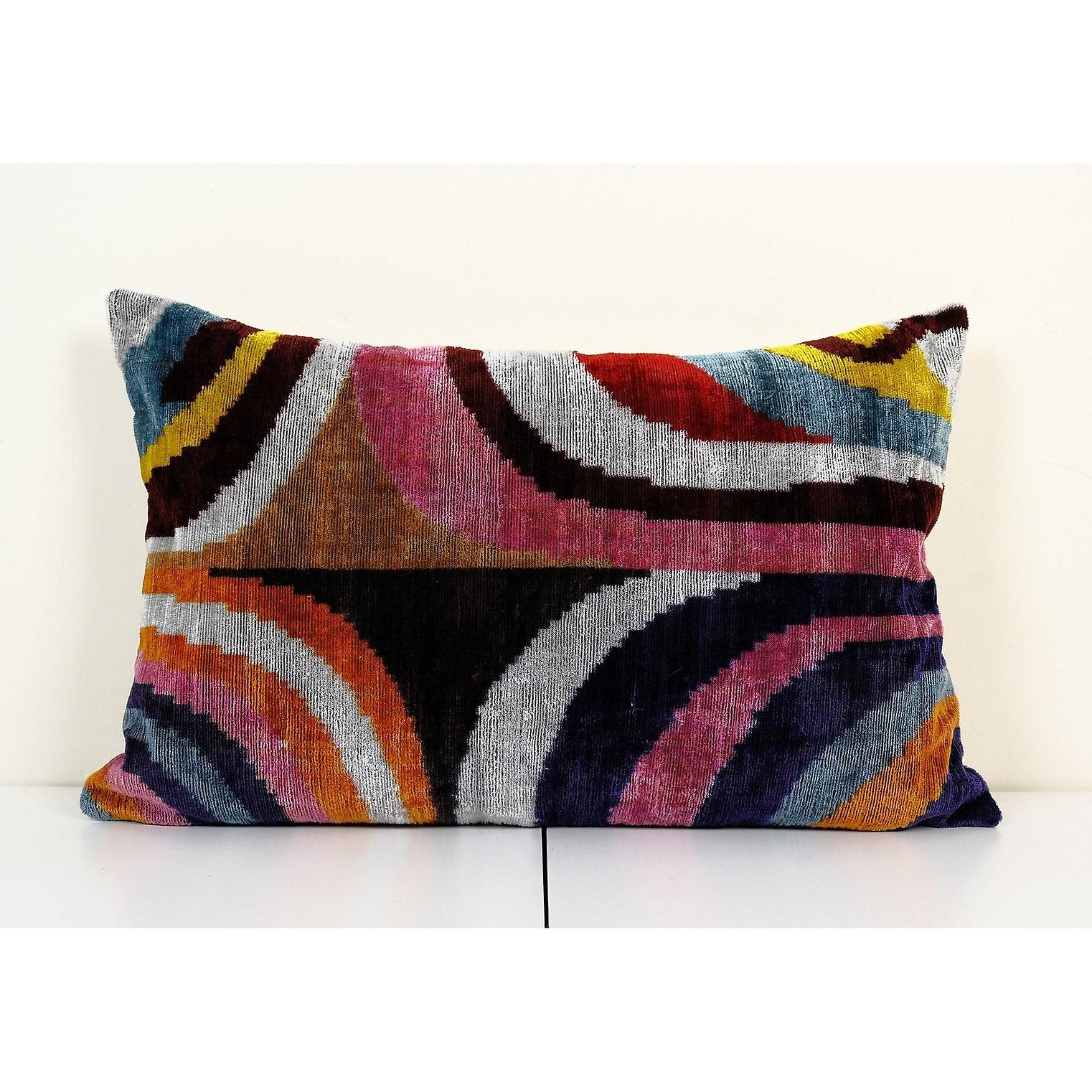 Ikat Velvet Pillow, Silk Ikat Lumbar Cushion, Colorful Ikat Lumbar