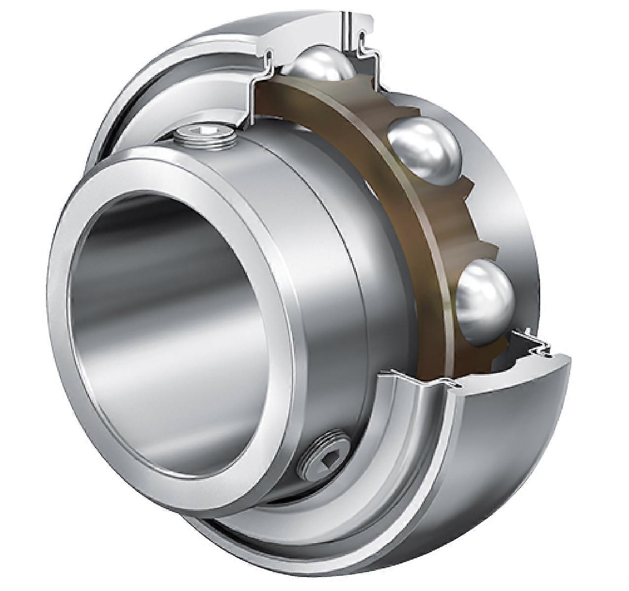 Radial insert ball bearings are single row, ready-to-fit units comprising a solid outer ring, an inner ring extended on one or both sides, cages made from plastic or sheet steel and seals of type P, R, L or T. Bearings with an inner ring extended on both sides undergo less tilting of the inner ring and therefore run more smoothly. The outer ring has a spherical or cylindrical outside surface. In combination with an INA housing matched to the design, bearings with a spherical outer ring can compensate for misalignment of the shaft. With only a few exceptions, radial insert ball bearings can be relubricated. For this purpose, they have two lubrication holes in one plane of the outer ring offset by 180. Radial insert ball bearings are particularly easy to fit and are suitable for drawn shafts of grade h6 up to h9. They are located on the shaft by means of eccentric locking collars, grub screws in the inner ring, adapter sleeves, drive slots or fit