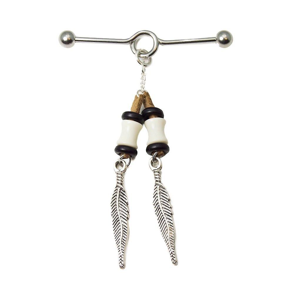 Industrial piercing barbell 14g with rhodium plated feathers dangle