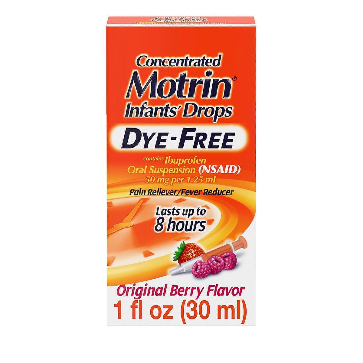 Help your little one feel better with Infants' Motrin Concentrated Liquid Medicine Drops. For every 1.25 milliliter dose, this infant's oral suspension contains 50 milligrams of the NSAID fever reducer and pain reliever, ibuprofen. This baby pain reliever medicine from a pediatrician-recommended brand provides up to eight hours of relief from fever as well as minor aches and pains due to the common cold, flu, sore throat, headaches and toothache. These alcohol-free and dye-free infants' ibuprofen drops come in a kid-friendly berry-flavored formula and can be used by infants 6 to 23 months. Plus, the enclosed syringe can make dosing and administering the infant ibuprofen liquid easy and mess-free. Infants' Motrin Oral Suspension Liquid Medicine Drops with Ibuprofen in a kid-friendly berry flavor to temporarily relieve your baby's minor aches & pains due to common cold, flu and sore throat The infant's oral suspension also provides temporary relief of headaches and teething pain Formulated with the NSAID ibuprofen, the liquid medicine is a baby pain reliever & fever reducer These alcohol & dye-free infant ibuprofen drops come in a non-staining and kid-friendly berry flavor, and the enclosed syringe can make dosing and administering the baby pain reliever easy and mess-free Intended for infants 6 to 23 months, the oral medicine provides temporary relief for up to 8 hours Concentrated Infants' Motrin Oral Suspension Liquid Medicine Drops for babies contain 50 milligrams of ibuprofen per 1.25 milliliter dose Directions: Directions ■ this product does not contain directions or complete warnings for adult use. ■ do not give more than directed (see overdose warning) ■ shake well before using ■ ml = milliliter ■ find right dose on chart below. If possible, use weight to dose; otherwise, use age. ■ remove the child protective cap and squeeze your child's dose into the dosing cup ■ repeat dose every 4 hours while symptoms last ■ do not give more than 5 times in 24 hours Weight (lb): under 24; Age (yr): under 2 years; Dose (ml) *: ask a doctor Weight (lb): 24-35; Age (yr): 2-3 years; Dose (ml) *: 5 ml Weight (lb): 36-47; Age (yr): 4-5 years; Dose (ml) *: 7.5 ml Weight (lb): 48-59; Age (yr): 6-8 years; Dose (ml) *: 10 ml Weight (lb): 60-71; Age (yr): 9-10 years; Dose (ml) *: 12.5 ml Weight (lb): 72-95; Age (yr): 11 years; Dose (ml) *: 15 ml * or as directed by a doctor Attention: use only enclosed dosing cup specially designed for use with this product. Do not use any other dosing device. Ingredients: Ibuprofen (NSAID)* *nonsteroidal anti-inflammatory drug 50.0mg Inactive Ingredients: Anhydrous Citric Acid, Caramel, Flavors, Glycerin, Polysorbate 80, Pregelatinized Starch, Purified Water, Sodium Benzoate, Sorbitol Solution, Sucrose, Xanthan Gum