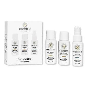 Innersense Organic Beauty's Pure Travel Trio is a travel-friendly Pure Harmony Hairbath, Pure Inspiration Daily Conditioner and Sweet Spirit Leave In Conditioner.IncludesPure Harmony Hairbath (2.0 oz)Pure Inspiration Daily Conditioner (2.0 oz)Sweet Spirit Leave in Conditioner (2.0 oz)Formulated WithoutPhthalatesEthoxylatesSulfatesSilicones1,4 dioxaneParabensPetro compoundsPropylene and butylene glycolPEGMEATEAMIAEDTA artificial dyesSynthetic fragrancesInactive Ingredients: Pure Harmony Hairbath: Water, Aqua- EAU, Cocamidopropyl Hydroxysultaine, Sodium Cocoyl Isethionate, Caprylyl/Capryl Glucoside, Glycerin, Sodium Chloride, Sodium Lauroyl Methyl Isethionate, Butyrosepermum Parkii (Shea Butter), Citrus Aurantium Dulcis (Orange) Peel Oil, Citrus Medica Limonum (Lemon) Peel Oil, Eucalyptus Globulus (Eucalyptus), Cucurbita Pepo (Pumpkin Seed Oil)*, Hydroxypropyltrimonium Honey, Hydrolyzed Quinoa, Trisodium Ethylenediamine Disuccinate, Sodium Benzoate, Hydrolyzed Rice Protein, Guar Hydroxypropyltrimonium Chloride, Persea Gratissima (Avocado) Oil, Oryza Sativa (Rice) Bran Oil, Camellia Sinensis (Green Tea) Leaf Extract*, Cucumis Sativus (Cucumber) Fruit Extract, Persea Gratissima (Avocado)* Fruit Extract, Mangifera Indica (Mango)* Fruit Extract. Pure Inspiration Daily Conditioner: Water, Aqua- EAU, Behentrimonium Methosulfate, Cetearyl Alcohol, Glycerin, Stearalkonium Chloride, Aloe Barbadensis (Aloe Vera) Leaf Juice*, Caprylic/Capric Triglyceride, Butyroseperum Parkii (Shea Butter)*Sodium Benzoate, Oryza Sativa (Rice) Bran Oil*, Persea Gratissima (Avocado) Oil*, Cocos Nucifera (Coconut Oil)*, Hydrolyzed Quinoa, Hydrolyzed, Rice Protein, Camellia Sinesis (Green Tea) Leaf Extract*. Sweet Spirit Leave In Conditioner: Water Aqua- EAU, Aloe Barbadensis (Aloe Vera) Leaf Gel*, Cetearyl Alcohol, Glycerin, Distearoylethyl Dimonium Chloride, Caprylic/Capric Triglyceride, Hydrolyzed Quinoa*, Gluconolactone, Sodium Benzoate, Calcium Gluconate, Potassium Sorbate, Benzyl Acetate, Linalyl Acetate, Citronellol+, Abies Balsamea Needle Oil*, Juniperus Virginiana (Cedar) Oil*, Alpha-Terpineol, Amyl Cinnamal+, Linalool+, Pogostemon, Cablin (Patchouli) Leaf Oil, Salvia Sclarea (Clary Sage) Oil, Citrus Reticulata (Tangerine) Peel Oil, Mentha Citrata Herb Oil, Eugenia Cayophyllus (Clove) Oil, Michelia Alba Leaf Oil, Lavandula Angustifolia (Lavender) Oil, Citrus Limon (Lemon) Peel Oil, Citrus Aurantifolia (Lime) Oil, Lavandula Hybrida (Lavandin) Oil, Cinnamomum Camphora (Camphor) Bark Oil, Alpha-lonone, Evernia Prunastri (Oakmoss) Extract, Anisaldehyde, Cistus Ladaniferus Resin, Menthol, Myristica Fragrans (Nutmeg) Kernel Oil, Jasminum Grandiflorum Flower (Jasmine) Extract, Nerol, Benzaldehyde, Chamomilla Recutita (Matricaria) Flower Extract*, Eucalyptus Globulus Leaf Extract*, Ginkgo Biloba Leaf Extract*, Aspalathus Linearis Leaf Extract*, Honey Extract*, Calophyllum Inophyllum (Tamanu) Oil, Rosmarinus Officinalis (Rosemary) Oil, Citric Acid, Eugenol+, Limonene+. *Certified Organic +A natural component of essential oilsSuggested Use: Take a deep breath and become centered. Apply a small amount of Pure Harmony Hairbath into hands and emulsify into a light lather. With fingertips, massage into scalp. Rinse thoroughly. Follow with Pure Inspiration Daily Conditioner applying from mid-length to ends with fingertips or comb. Leave on 1-5 minutes. Rinse thoroughly. Finish with Sweet Spirit Leave In Conditioner and spray onto wet hair.
