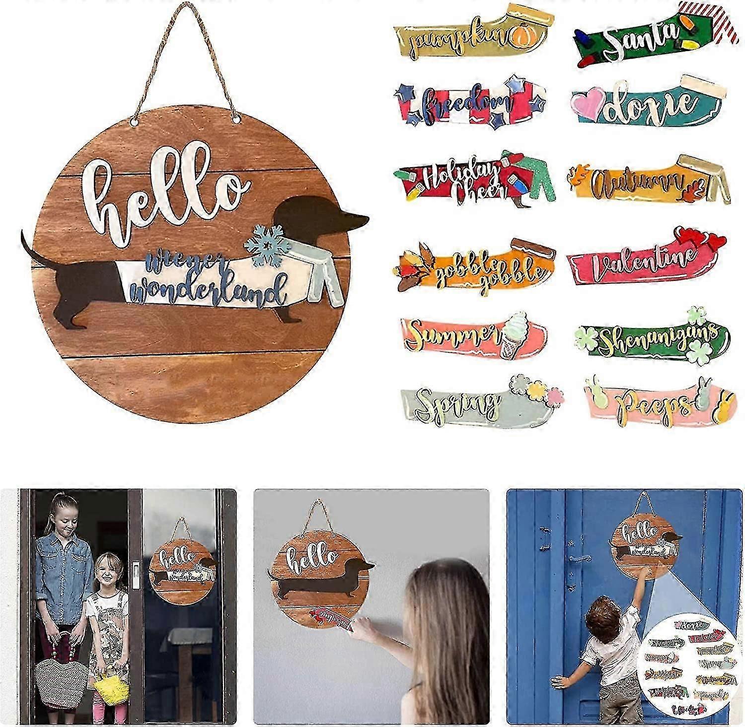Interchangeable Seasonal Welcome Sign Front Door Decoration, Dog Pet Hanger Ornaments Wood Wreaths Hanging Decor