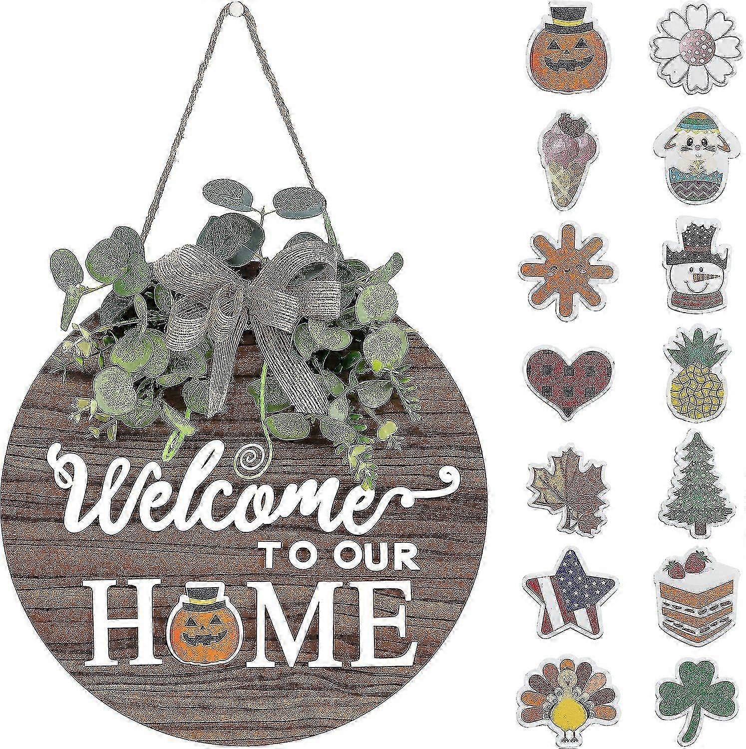 Interchangeable Seasonal Welcome Sign Front Door Decoration, Rustic Round Wood Wreaths Wall Hanging Outdoor, Farmhouse, Porch, For Spring Summer Fall