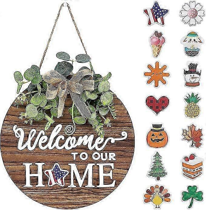 Interchangeable Seasonal Welcome Sign Front Door Decoration, Rustic Round Wooden Wreath Wall Hanging Outdoor, Farmhouse, Porch, Perfect for Spring, Summer, Autumn, Holidays, Halloween, Christmas.Material: This round welcome sign is made of high quality wood, using high quality hot melt glue to attach faux greenery and decorations to the board. Our products bring good enjoyment to people.Uses: Welcome signs can be used to decorate our living rooms, rooms, kitchens, farmhouse front doors, flower house front doors, beach log cabins, coffee shop facades and home decor, etc.Dimensions: Measures 12 x 12 inches / 30 x 30 cm. This ratio works for most door frame ratios. Make the door frame more like a story.MULTIPLE THEME USES: Our front door welcome sign can be used as a patriotic decoration or as a decoration to complement other decorations. Our wood wreaths can also be used for Valentine's Day, St. Patrick's Day, Easter, Fourth of July decorations, home decor, harvest day, Halloween, Christmas and other holiday fall decorations. We can switch scenes according to different vacations, and one thing can be used for multiple purposes.