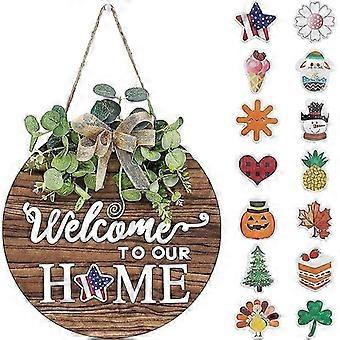 Interchangeable Seasonal Welcome Sign Front Door Decoration, Rustic Round Wooden Wreath Wall Hanging Outdoor, Farmhouse, Porch, Perfect for Spring, S