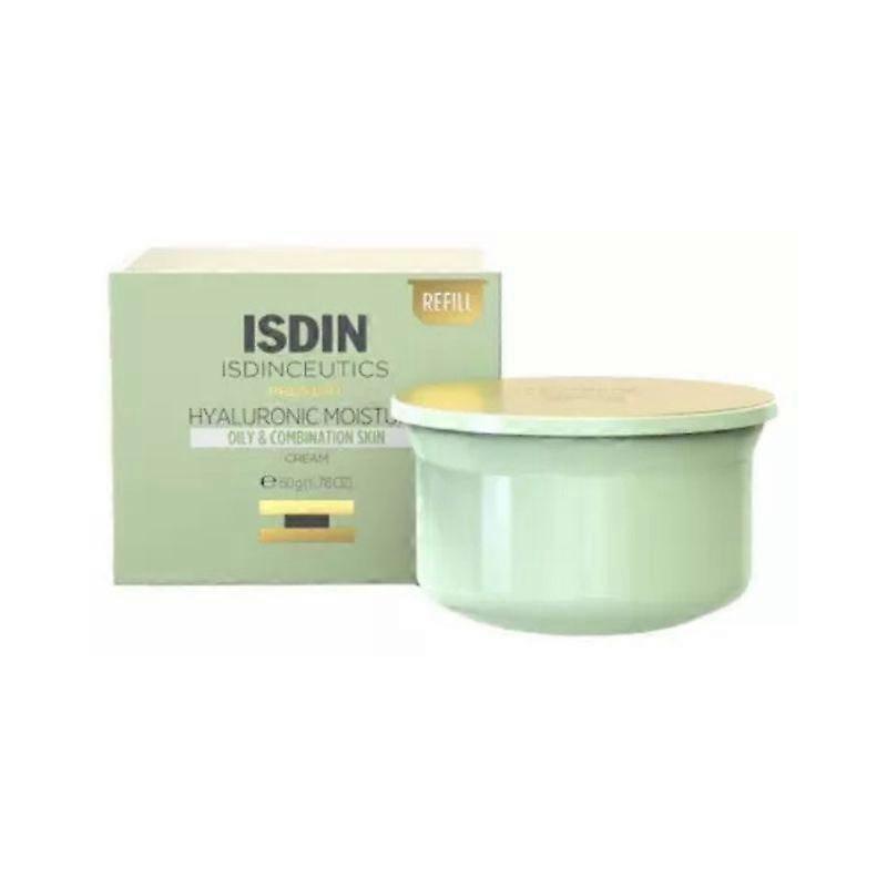Isdin Isdinceutics Prevent Hyaluronic Moisture Oily and Combination Skin Refill 50g is a moisturizing, mattifying face cream designed for oily and combination skins.Thanks to its hyaluronic acid-rich formula, this light, fast-absorbing cream helps reduce excess sebum, minimizes the appearance of pores and visibly reduces skin shine, revealing a matte appearance. Skin is refreshed, balanced and hydrated.It associates:Tri-Moisture Complex, a combination of medium and low molecular weight hyaluronic acid and Pro-Vitamin B5, a hydrating polymer complex, for intense, long-lasting hydration.Multi-Protection Complex, with Vitamin E, Exo-P and VitA Tech, for antioxidant, anti-pollution and anti-aging protection.Matte-Complex, ingredients based on natural sugars that rebalance skin flora and help control the appearance of skin imperfections. It contains Lens esculenta, a naturally-derived ingredient that reduces the appearance of pores and regulates oil production, for luminous skin.Non-comedogenic.Formulated with 82% ingredients of natural origin.