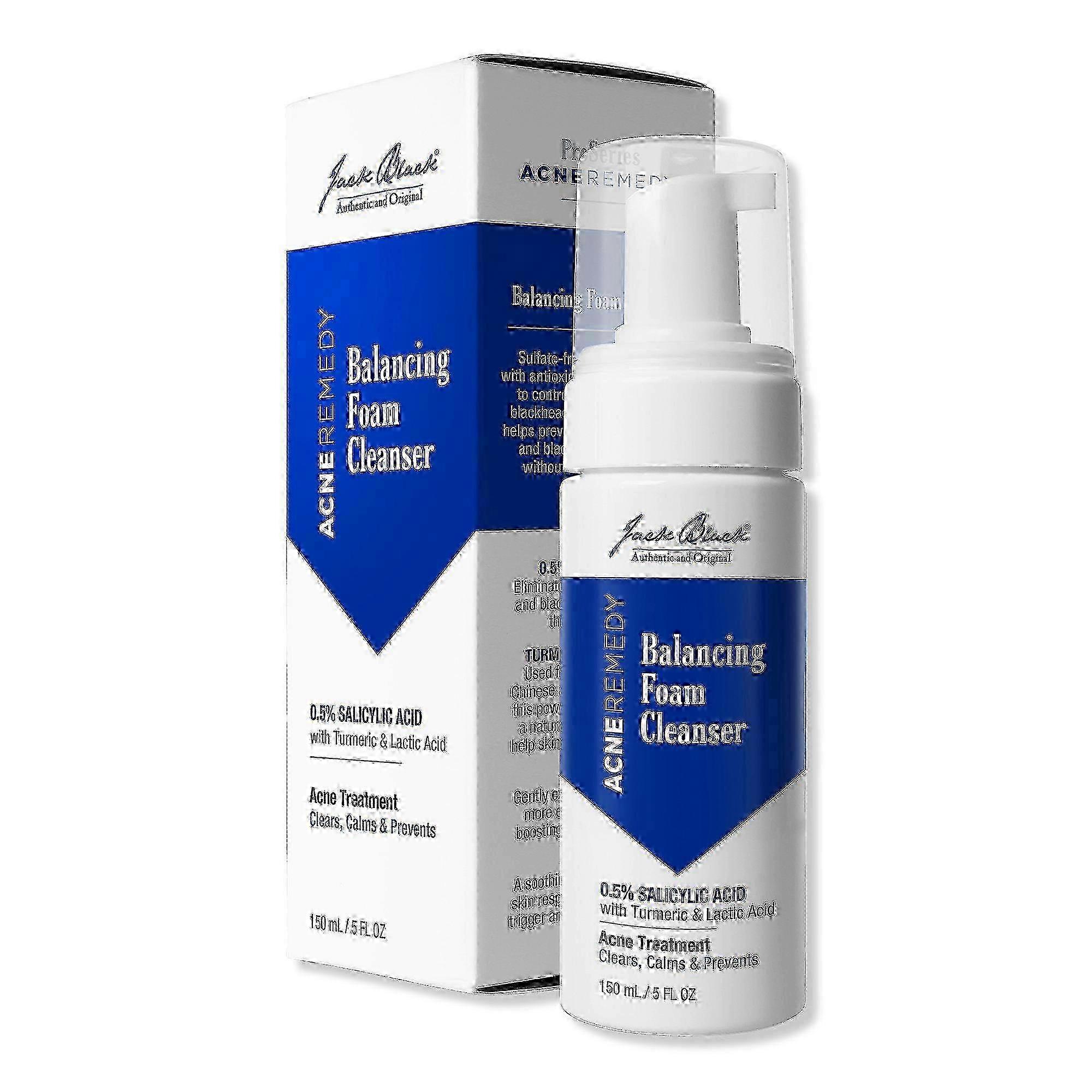 Jack Black's Acne Remedy Balancing Foam Cleanser is a sulfate-free foaming cleanser with antioxidants penetrates pores to control acne blemishes and blackheads. Benefits Oil FreeVeganSulfate FreeAlcohol FreeParaben freeColorant FreeFragrance FreeDermatologist TestedCruelty Free Key Ingredients 0.5 % Salicylic Acid: Eliminates most acne blemishes and blackheads and helps keep them from formingTurmeric Root Extract: Used for over 2,500 years in Chinese and Ayurvedic medicine, this powerful adaptogenic root is a natural antioxidant known to help skin fight external stressors. Natural remedy that is known to gently clarify, nourish, and balance the skinLactic Acid: Gently exfoliates for a smoother, more even complexion while boosting skin’s moisture levelsAloe Vera: A soothing adaptogen that helps skin respond to stresses that can trigger an inflammatory responseBisabolol: Known to help fight bad bacteria and helps reduce the appearance of redness and soothe skin Suggested Use: Dispense 1-2 pumps into hand, apply to damp or dry face, and massage into skin in a circular motion. Rinse thoroughly with warm water and pat dry. Use morning and evening. Precautions: When starting a new acne regimen, additional breakouts may occur initially. This is caused by a natural purge of bacteria. A consistent, daily acne treatment routine can help break the cycle. For external use only. Avoid direct eye contact. If product enters eyes, rinse with water. Expiration Date: We have fresh stock each week with exceptional expiration dates prior to APRIL 2024. Products will expire no later than six months to 1 year after receipt. Product Packaging: Please note that some manufacturer may often change their packaging. This product may arrive different from what is pictured. We will always ship the most up-to-date packaging to our customers. Please contact us if you have any questions about this product or would like to request an older version of this product. Healthcare Disclaimer: Content on this site is for reference purposes only. OTC Shoppe Express does not represent or warrant that the nutrition, ingredient, allergen and other product information on our Web or Mobile sites are accurate or complete, since this information comes from the product manufacturers. On occasion, manufacturers may improve or change their product formulas and update their labels. We recommend that you do not rely solely on the information presented on our Web or Mobile sites and that you review the product's label or contact the manufacturer directly if you have specific product concerns or questions. If you have specific healthcare concerns or questions about the products displayed, please contact your licensed healthcare professional for advice or answers. UPC: 000002579225 Weight: 0.82 lbs