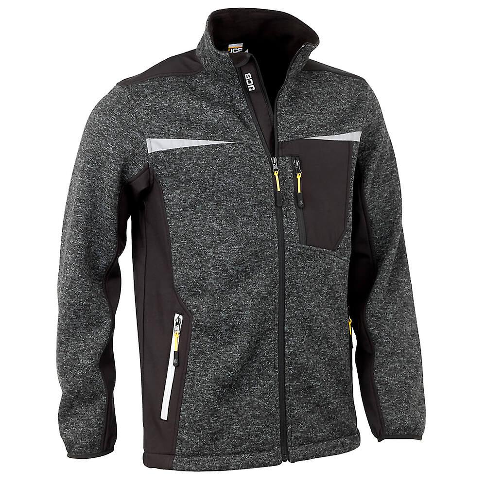 Key Features and Benefits Knitted fabric: 100% polyester 370gsm Softshell fabric: 100% stretch polyester 280gsm Full zip style Two side entry zipped pockets Zipped left chest pocket Elasticated taped cuffs Elasticated drawcord around bottom hem Reflective tape on chest and shoulders Reflective JCB branding