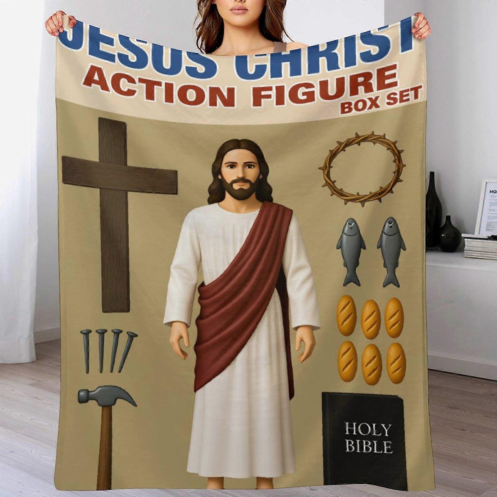"JESUS CHRIST ACTION FIGURE BOX SET" Print Flannel Blanket - Soft Warm Throw for Living Room | Humorous Faith-Based Gift for Christian Adults