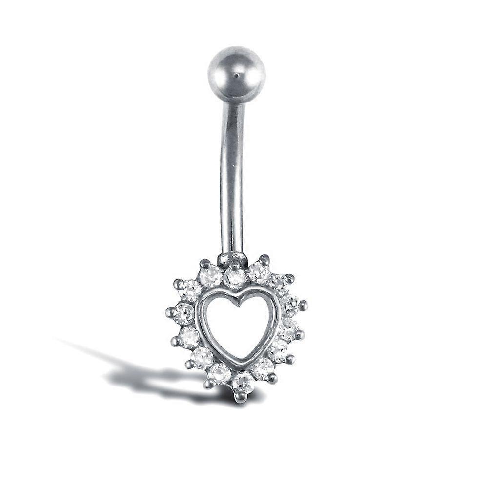 Jewelco London Ladies 9ct White Gold White Round Brilliant Cubic Zirconia Love Heart Banana Belly Bar, 10mm