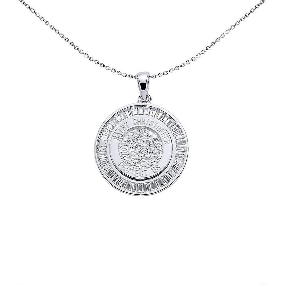 Jewelco London Ladies Sterling Silver Baguette Cubic Zirconia St Christopher Halo Medallion Necklace 18 inch
