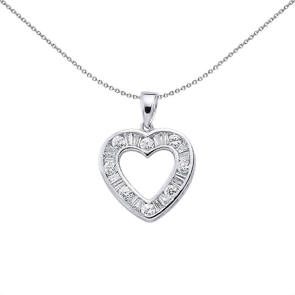 Jewelco London Ladies Sterling Silver Baguette Cubic Zirconia Love Heart Pendant Necklace 18 inch