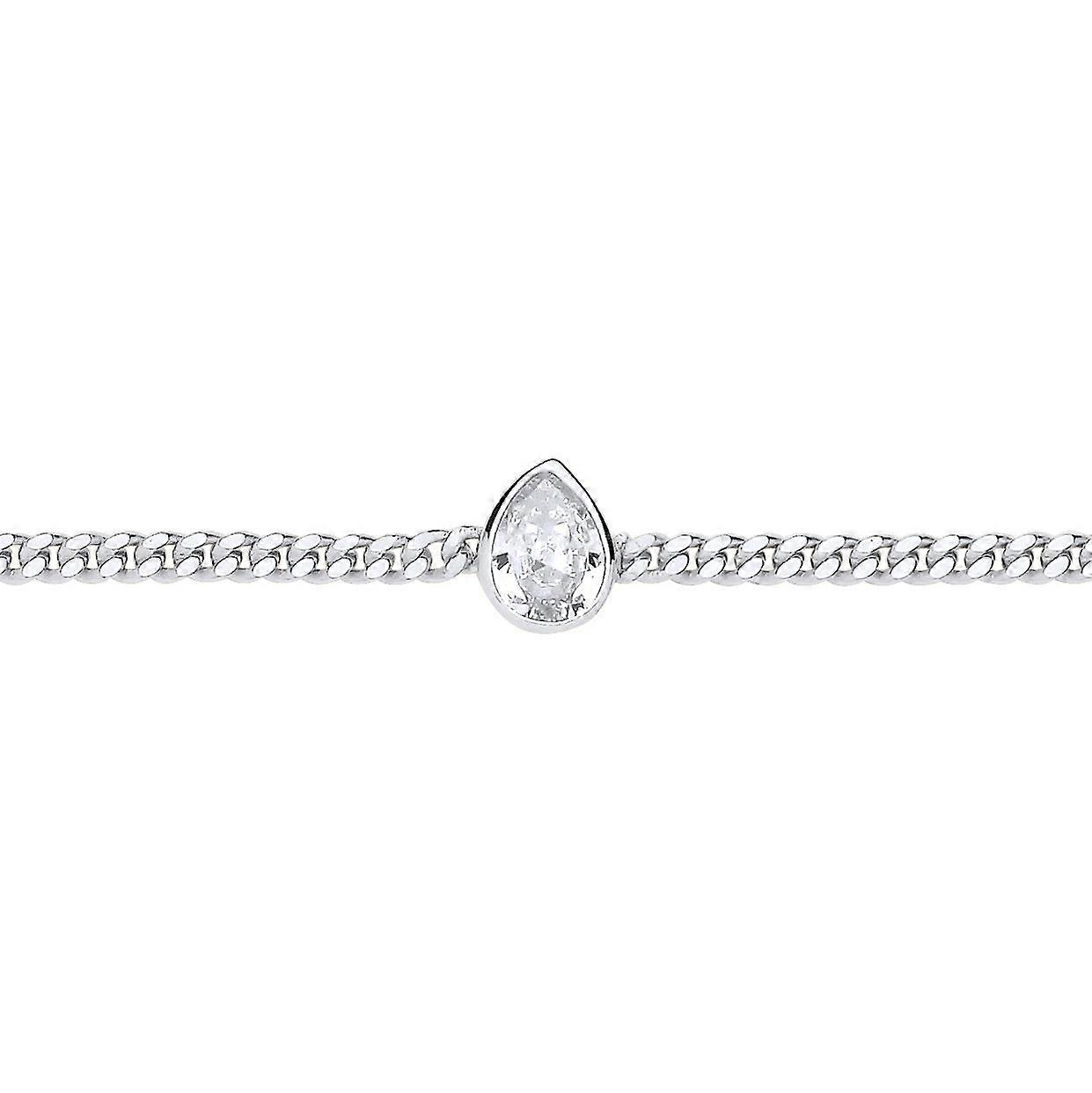 Jewelco London Ladies Rhodium Plated Sterling Silver Pear CZ Bezel Solitaire Curb Chain Bracelet 3mm 7.5 + 1 inch