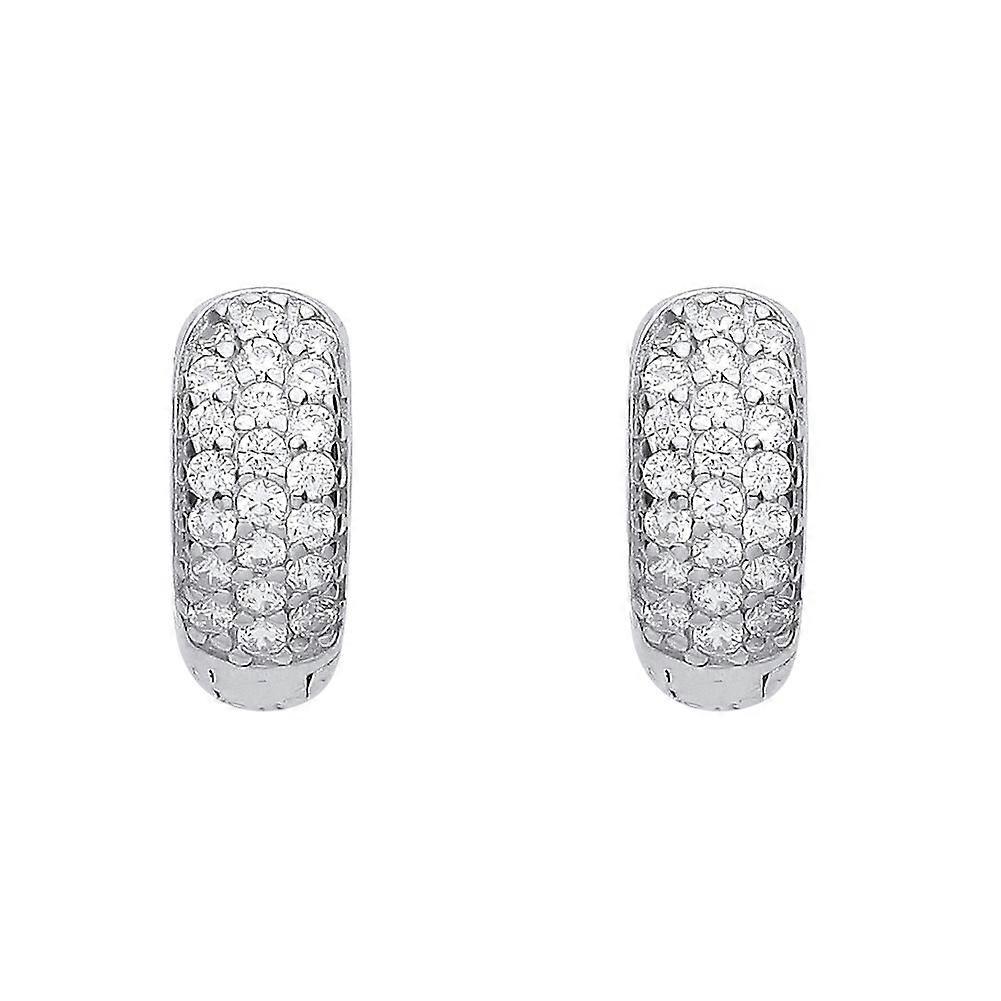 Jewelco London Ladies Rhodium Plated Sterling Silver CZ Domed 3 Row Pave Huggie Hoop Earrings