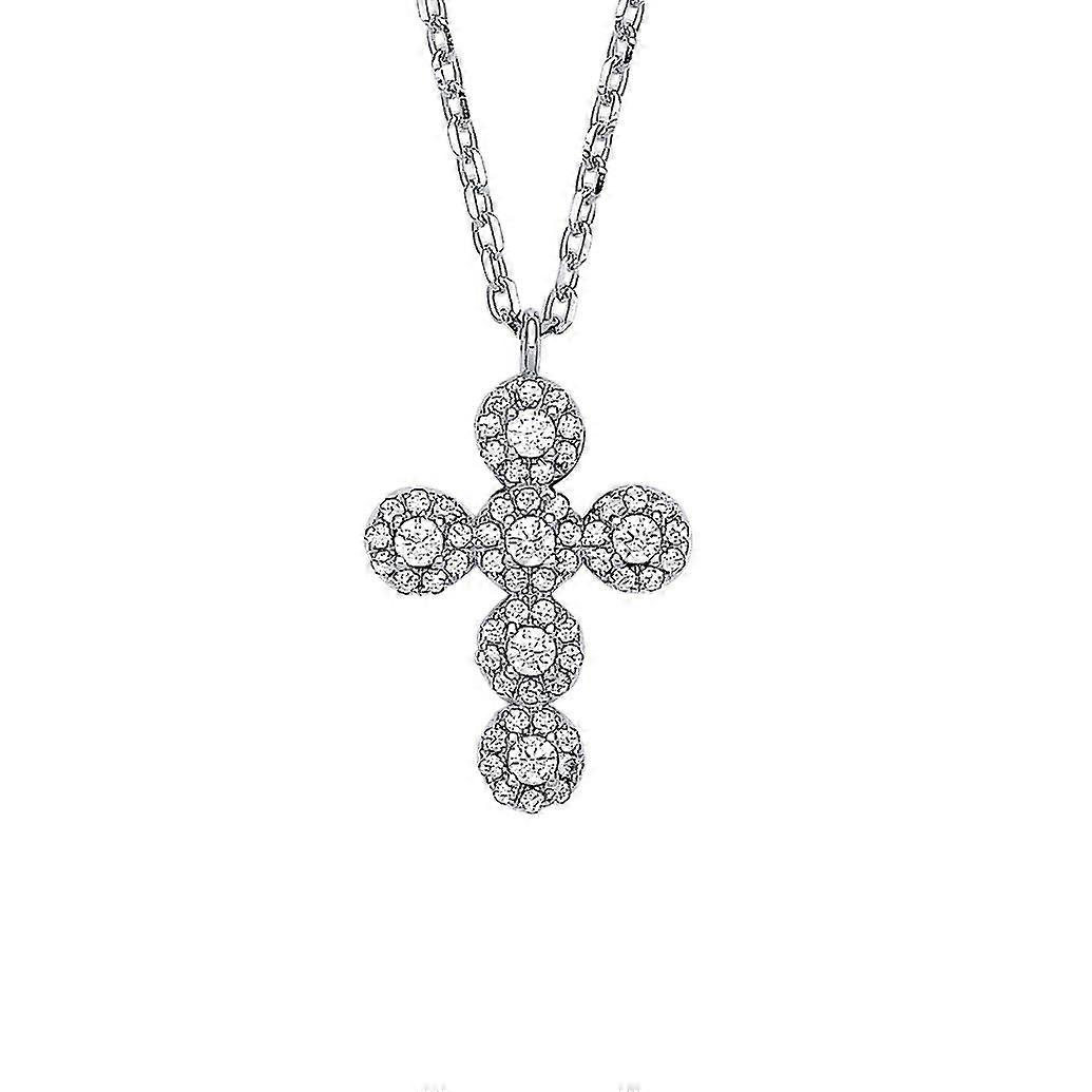 Jewelco London presents this piece from its latest collection of jewellery, a ladies pendant necklace made of rhodium plated sterling silver in a bubbly halo cross pendant design, set with white round cubic zirconia gemstones. Approx dimensions: 16 + 2 inch | Height: 20mm Width: 13mm Weight: 3.2g GEMSTONE: Cubic Zirconia, Round, White, Simulated SKU: GVK407