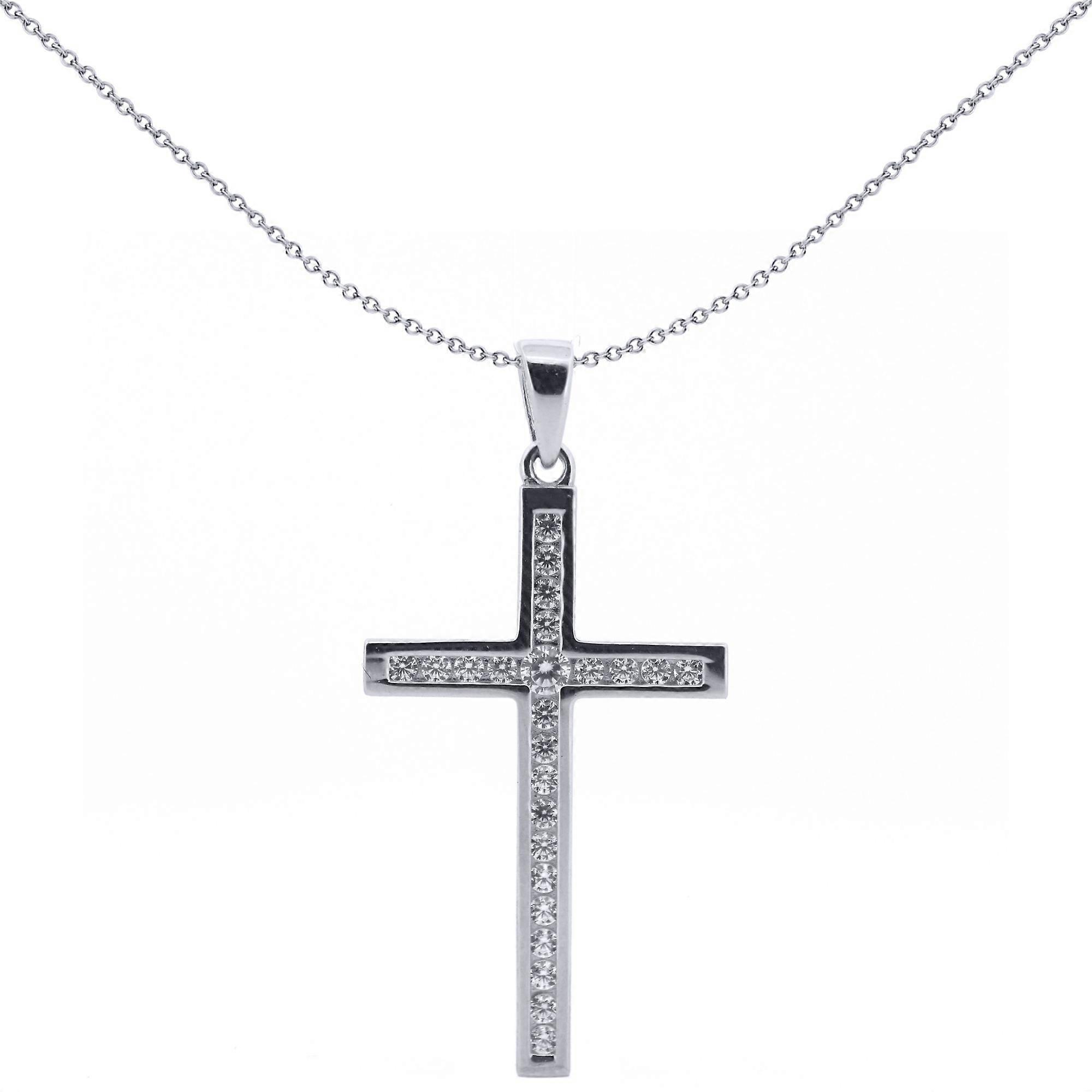 Jewelco London Solid 9ct White Gold Cubic Zirconia Art Deco Outline Channel Set Cross Pendant