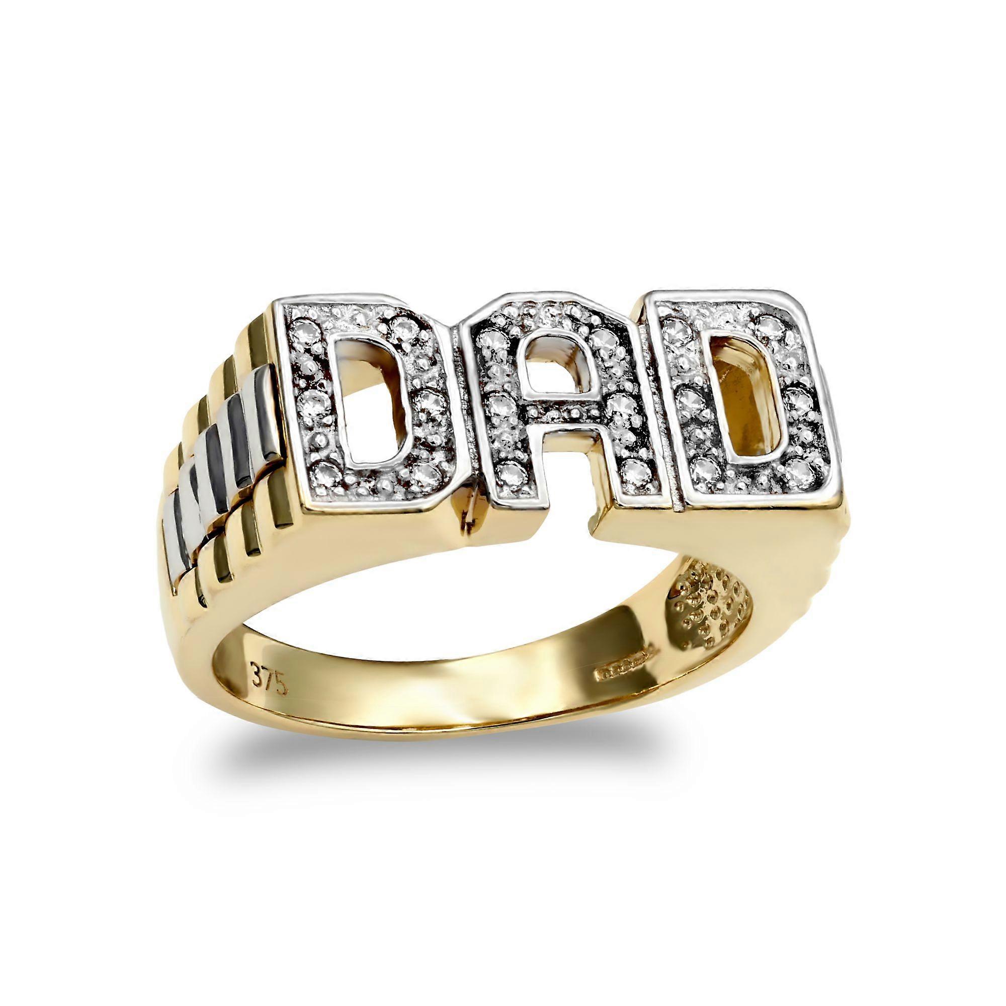 Jewelco London Men's Solid 9ct Yellow Gold White Round Brilliant Cubic Zirconia Brick Link Sides DAD Ring