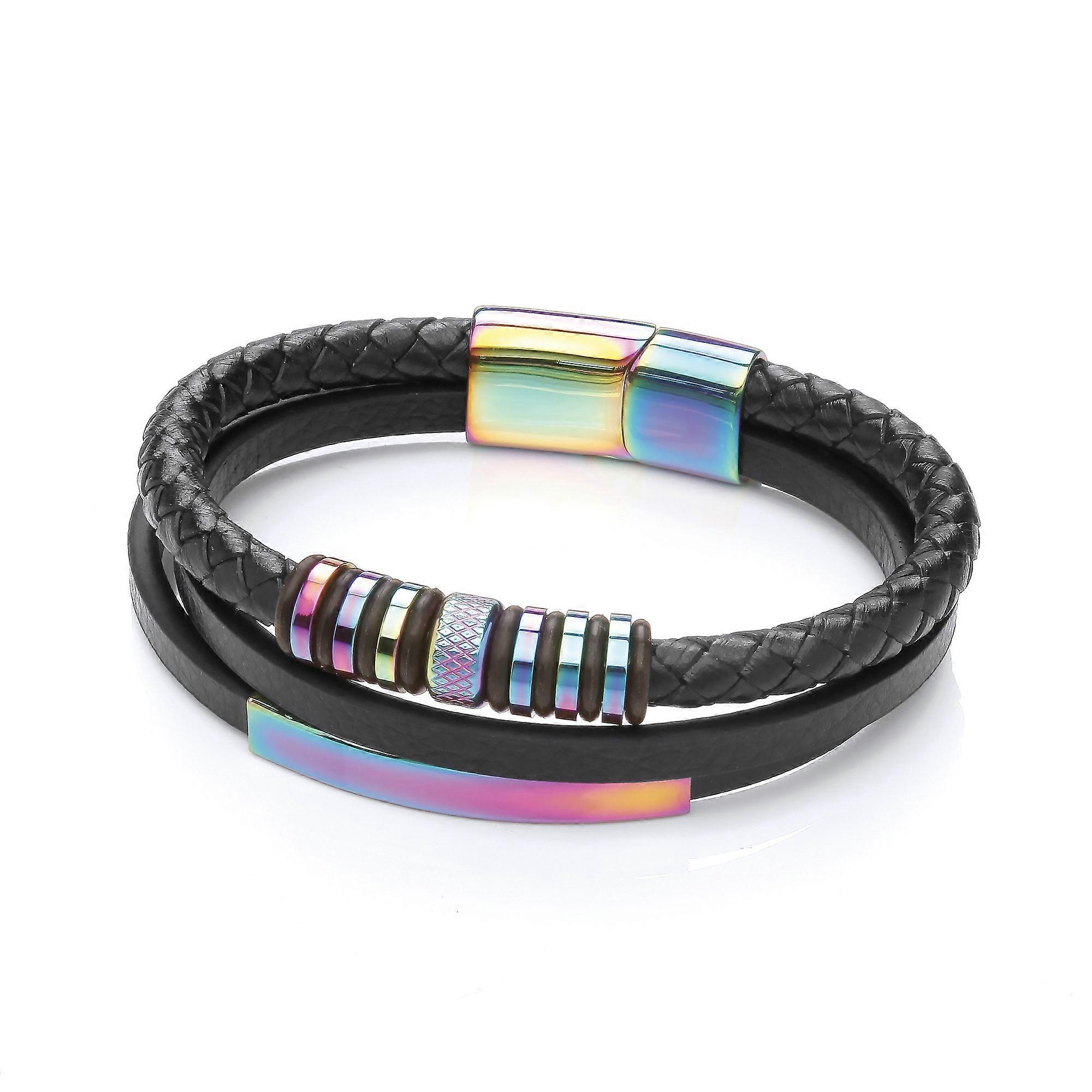 Jewelco London Mens Black Leather Stainless Steel Rainbow Iridescent Multi Strand Plaited ID Bar Strap Bracelet 8 inch