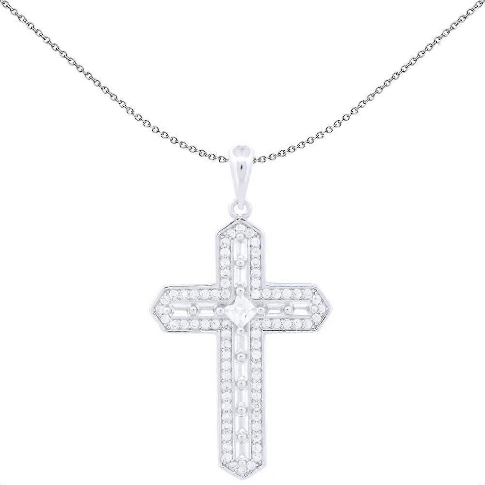 Jewelco London Unisex Rhodium Silver White Princess Baguette CZ Ancrusted Arrowhead Cross Pendant