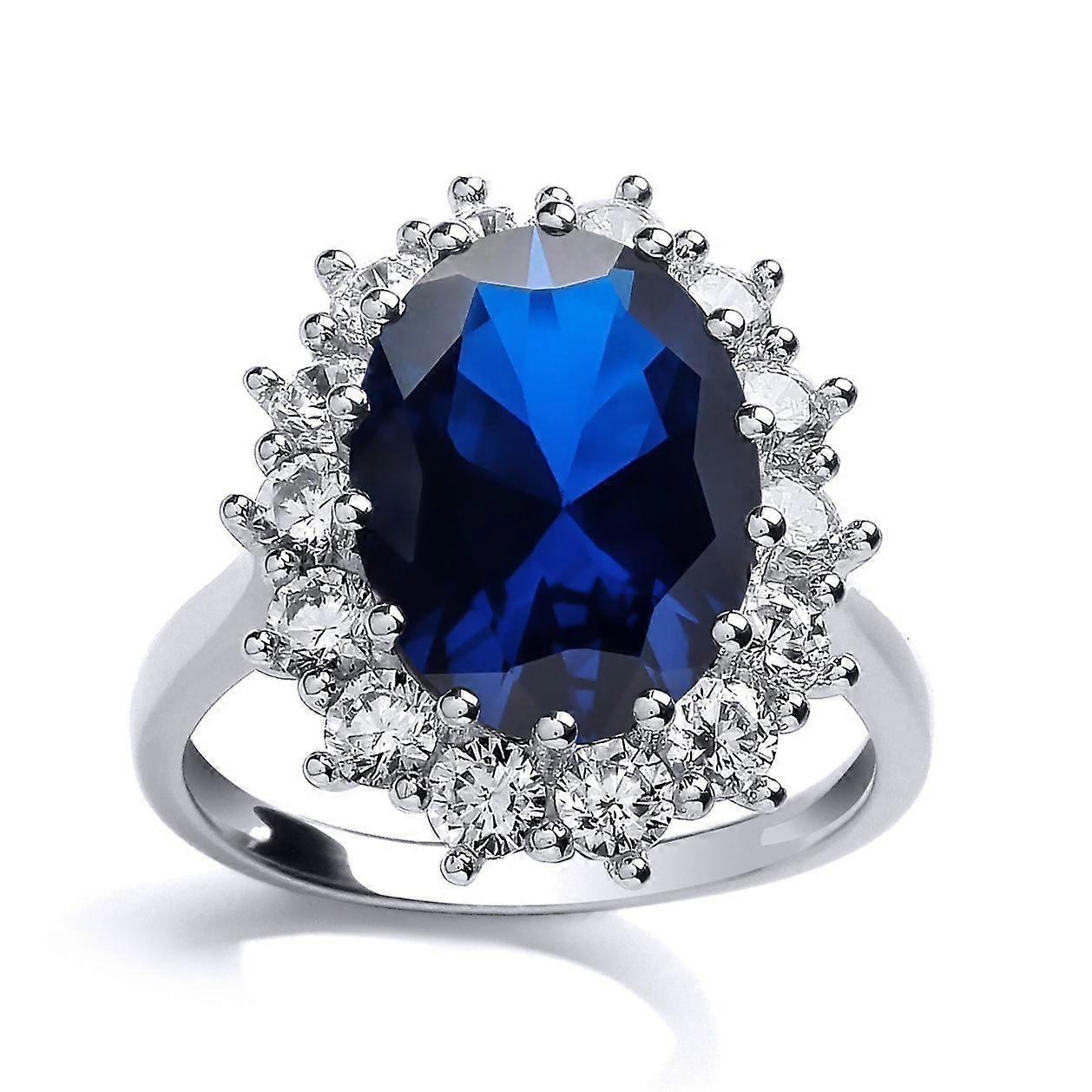 Jewelco London Sterling Silver Sapphire-Blue Oval Cubic Zirconia Royal Princess Cluster Solitaire Engagement Ring