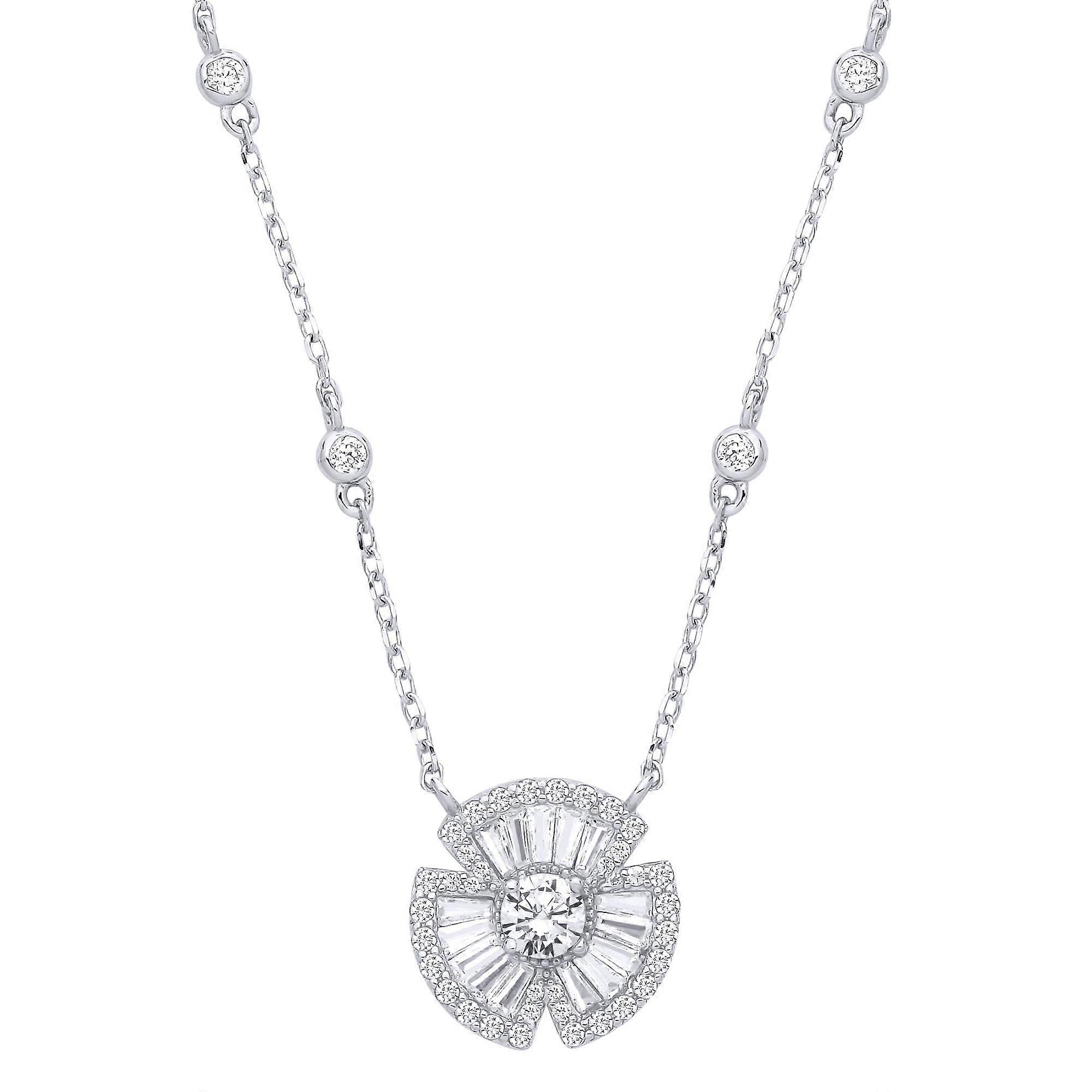 Jewelco London presents this piece from its latest collection of jewellery, a station necklace made of rhodium plated sterling silver in a art deco clover bow fan solitaire pendant design, set with gemstones. Approx dimensions: 14.5mm | 17 + 2 inch | Length: 475mm Gauge: 14.5mm GEMSTONE: Cubic Zirconia, Baguette, White, Simulated GEMSTONE 2: Cubic Zirconia, Round, White, Simulated SKU: GVK501