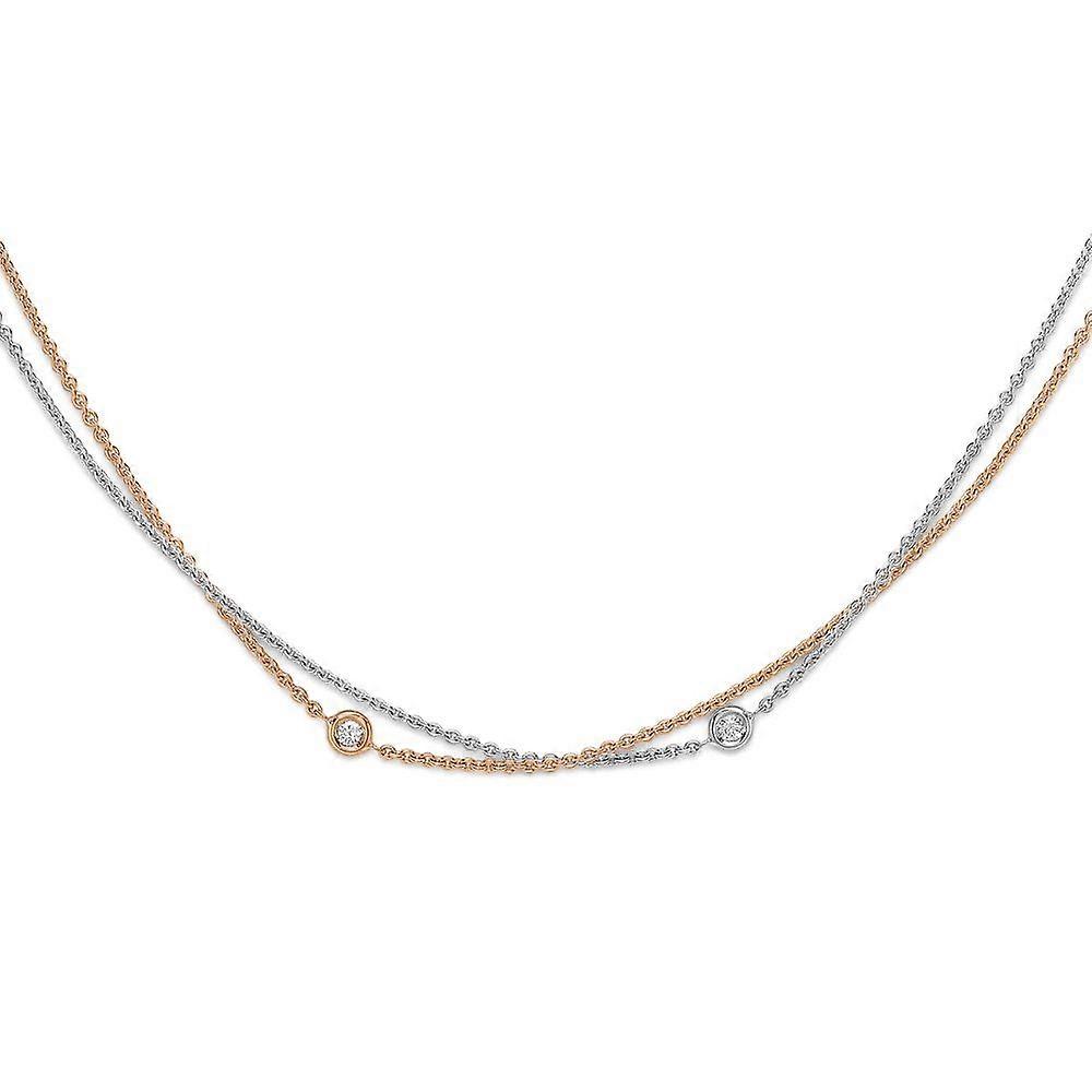 A classic and simple Diamond two strand necklet in white and rose 18ct Gold. Constructed of trace chain and six button stations each featuring a brilliant cut Diamond, total weight 0.15ct. Overall Dimensions: Button stations 3mm x 3mm Length: 425mm GEMSTONE: Diamond, Si, 0.15ct, Natural SKU: CWNR02147-17