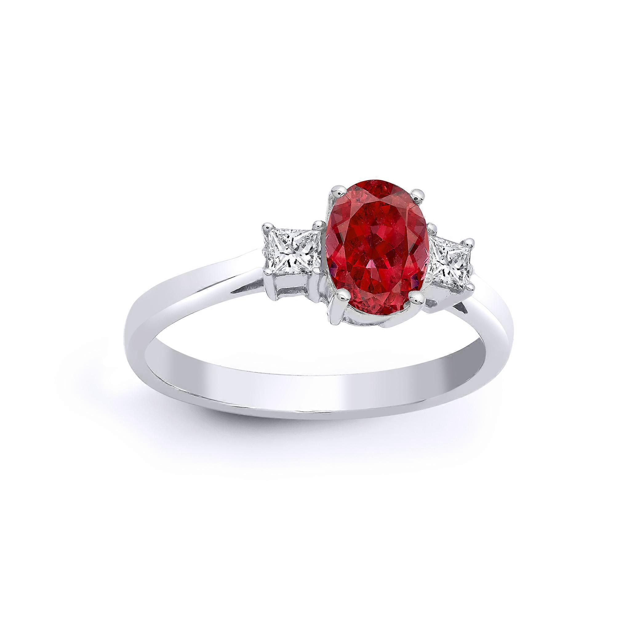 Jewelco London 18ct White Gold 4 Claw Set Princess G SI 0.2ct Diamond and Oval Red 1ct Ruby Trilogy Ring 7mm