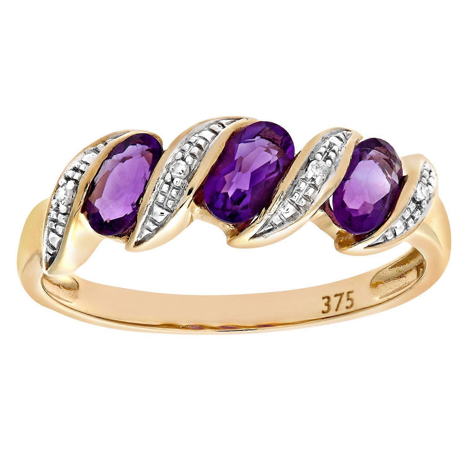 Jewelco London 9ct Gold Round 2pts Diamond Oval 0.59ct Amethyst Wavy Ribbon Pod Trilogy Cocktail Ring 2mm