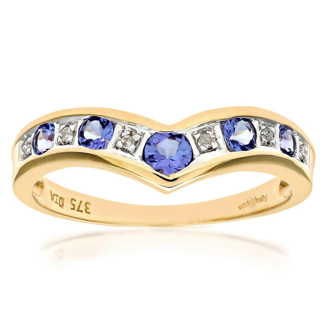 Jewelco London 9ct Yellow Gold Round 2pts Diamond Round 0.38ct Tanzanite Alternating Channel Wishbone Ring 2mm