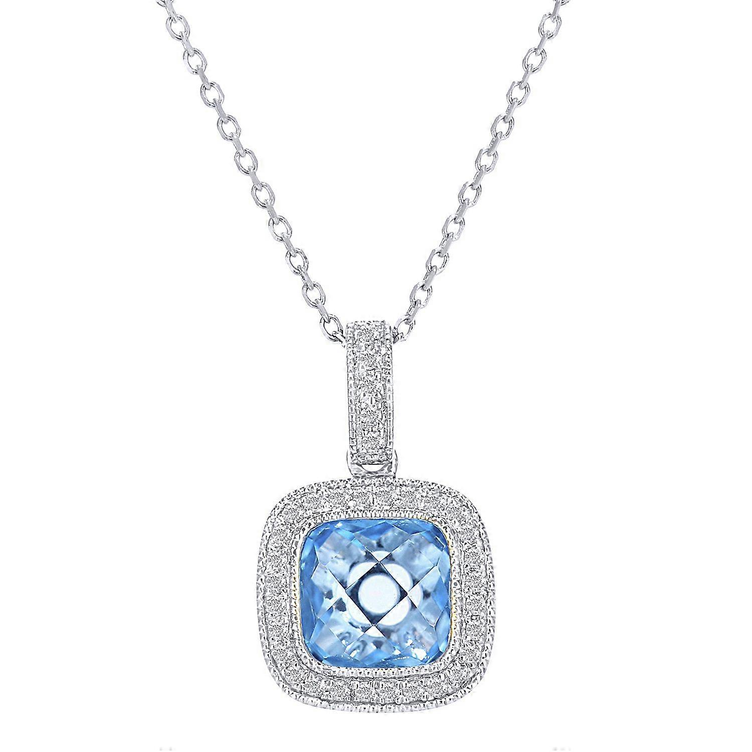 Jewelco London 9ct White Gold Round 10pts Diamond Cushion 1.75ct Blue Topaz Cocktail Pendant Necklace 16 inch 42cm