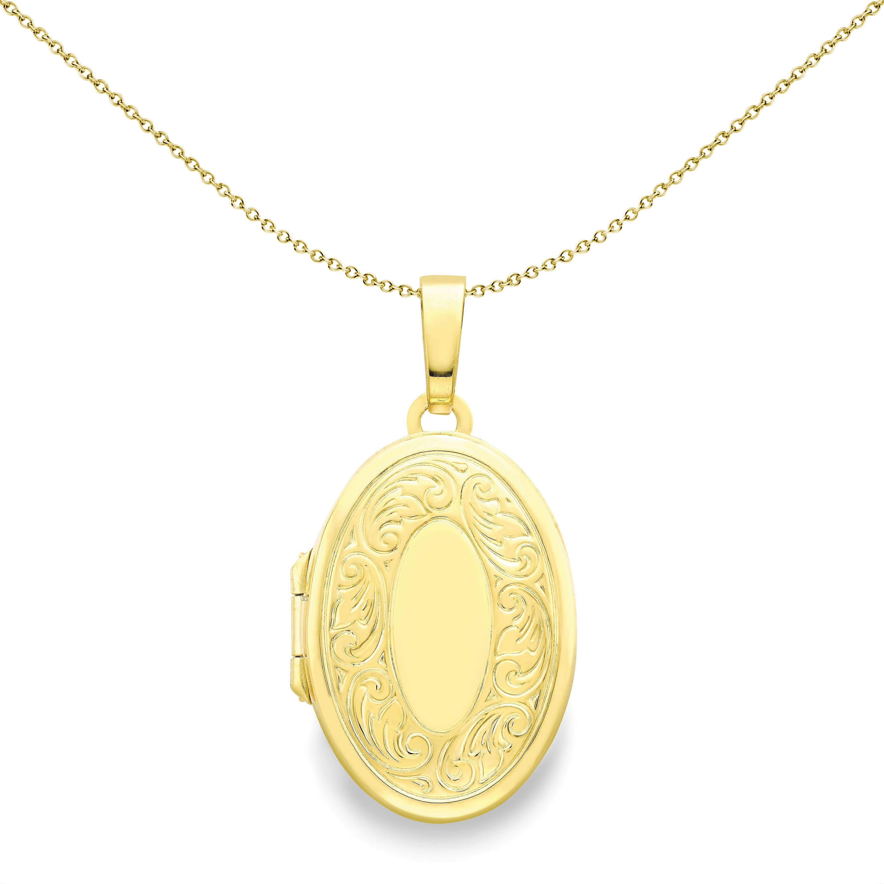 A classic mid sized oval shaped locket with a simple engraved motif. Will Approximately 23x16mm. Nine carat gold. Includes a Yellow Gold-Plated Sterling Silver chain, which can be adjusted to 16, 18 or 20 inches. Overall Dimensions: 23mm x 16mm Height: 23mm Width: 16mm SKU: LKNR02242