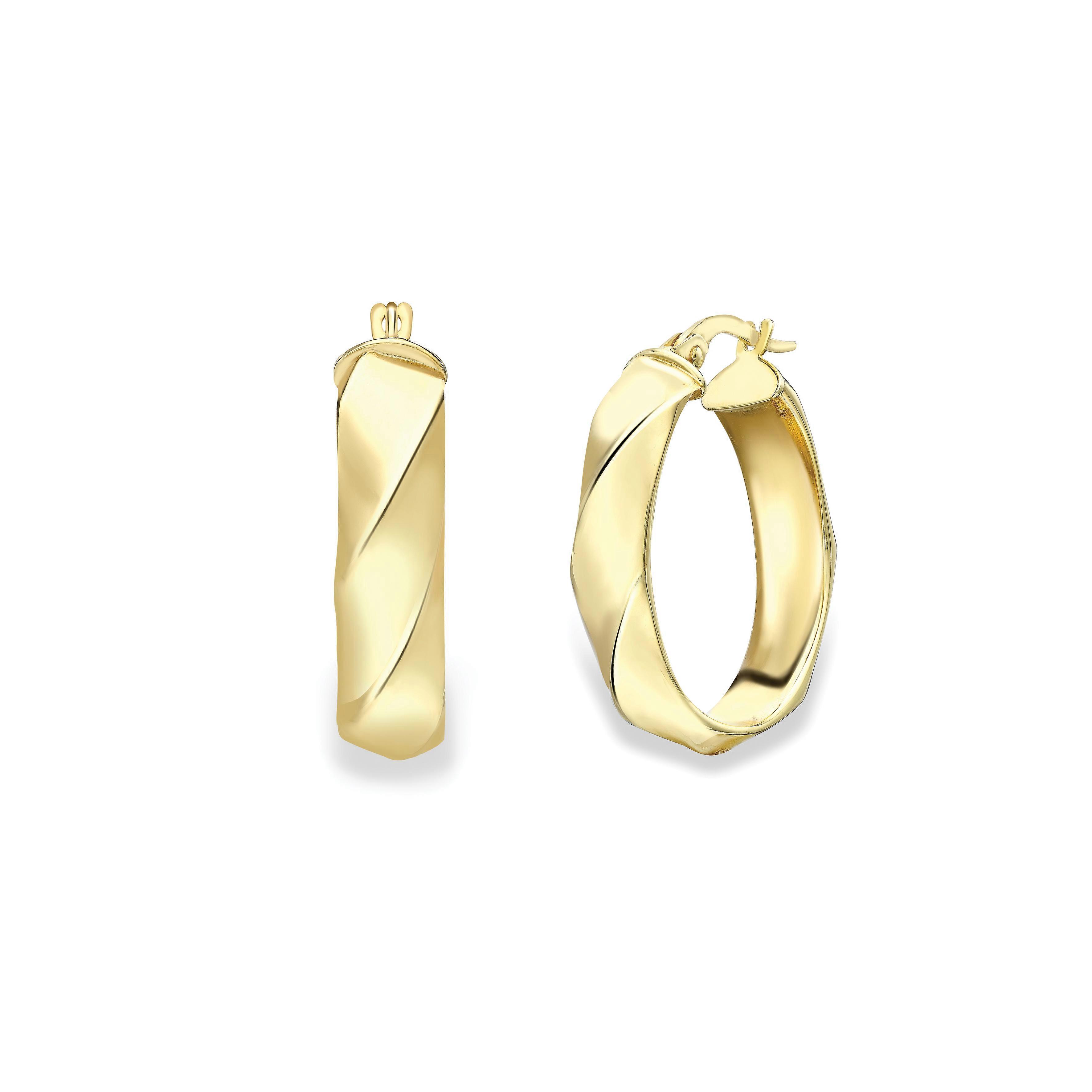 The polished finish on these oval hoops revives the candy twist theme! Fitted with a hinged bar closure. Approximately 13x19mm. Made in Italy. Nine carat gold. Overall Dimensions: 13mm x 19mm Height: 19mm Width: 13mm Weight: 2g SKU: EANR02233